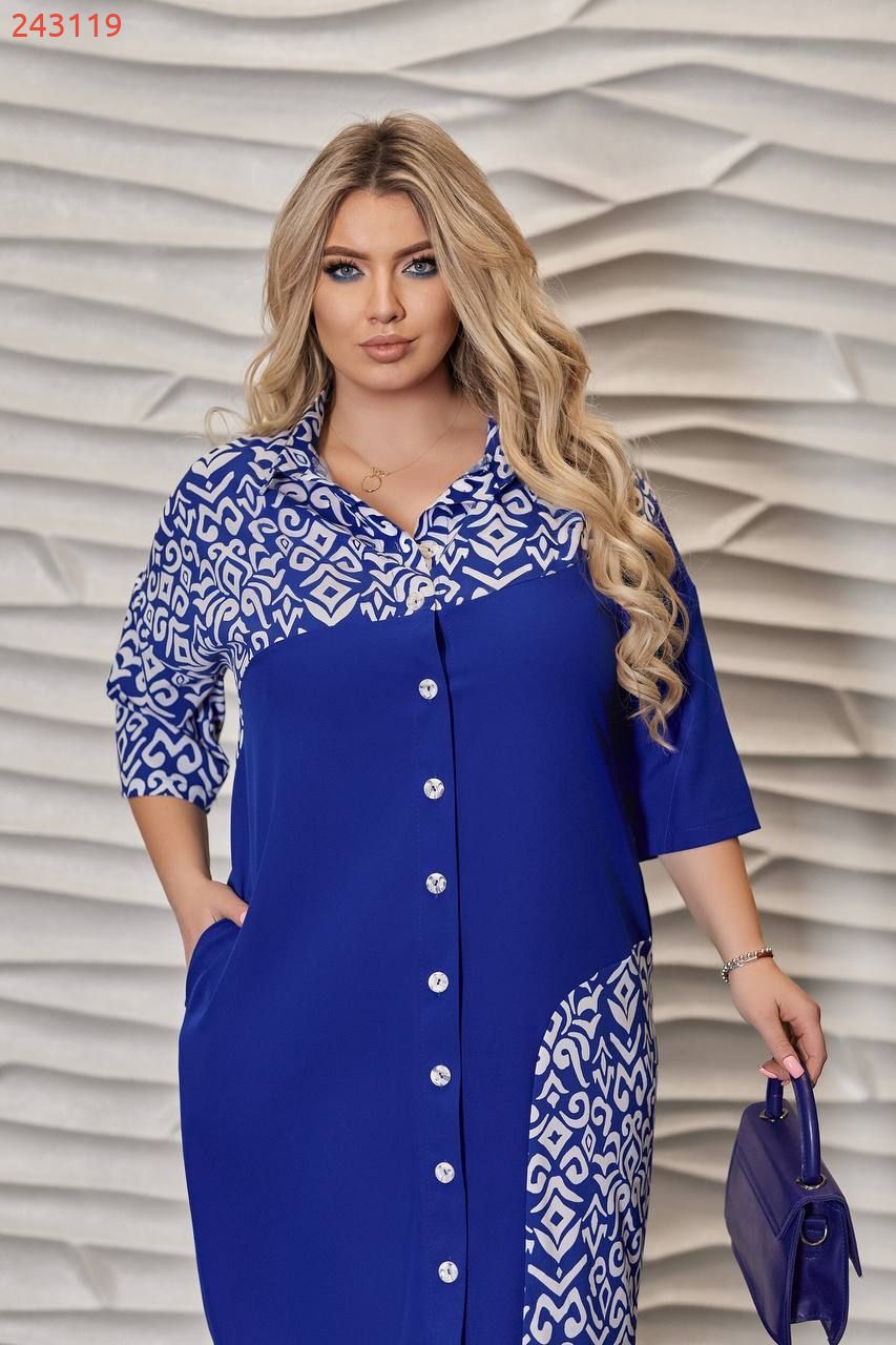 Сукня сорочка прямого крою, рукав три чверті, зі спущеним плечовим швом. В бічних швах є кишені, застібається на ґудзики.