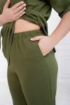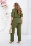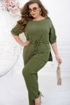 Мінімалістичний костюм батал, футболка без застібок та кишень, через талію під куліскою пропущено шнурок, з боків подолу - розрізи. Виріз горловини півкруглий. На рукавах невеликі відвороти. Брюки з високою талією, до поясу вшито резинку, з боків - кишені в шві.