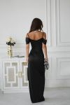 Елегантна сукня зі спущеними рукавамина на брителях, оздоблена драпіруванням у зоні декольте, що надає образу витонченості та жіночності. Сукня ідеально підходить для особливих випадків, таких як весілля, вечірки або фотосесії.