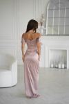 Елегантна сукня зі спущеними рукавамина на брителях, оздоблена драпіруванням у зоні декольте, що надає образу витонченості та жіночності. Сукня ідеально підходить для особливих випадків, таких як весілля, вечірки або фотосесії.