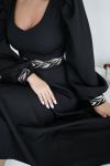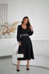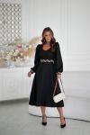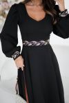 Вишукана сукня довжини міді з контрастною вишивкою на талії та манжетах. Глибокий V-подібний виріз візуально подовжує шию та додає образу нотку романтичності, а довгі рукави з легким об’ємом надають м'якості та плавності лініям.