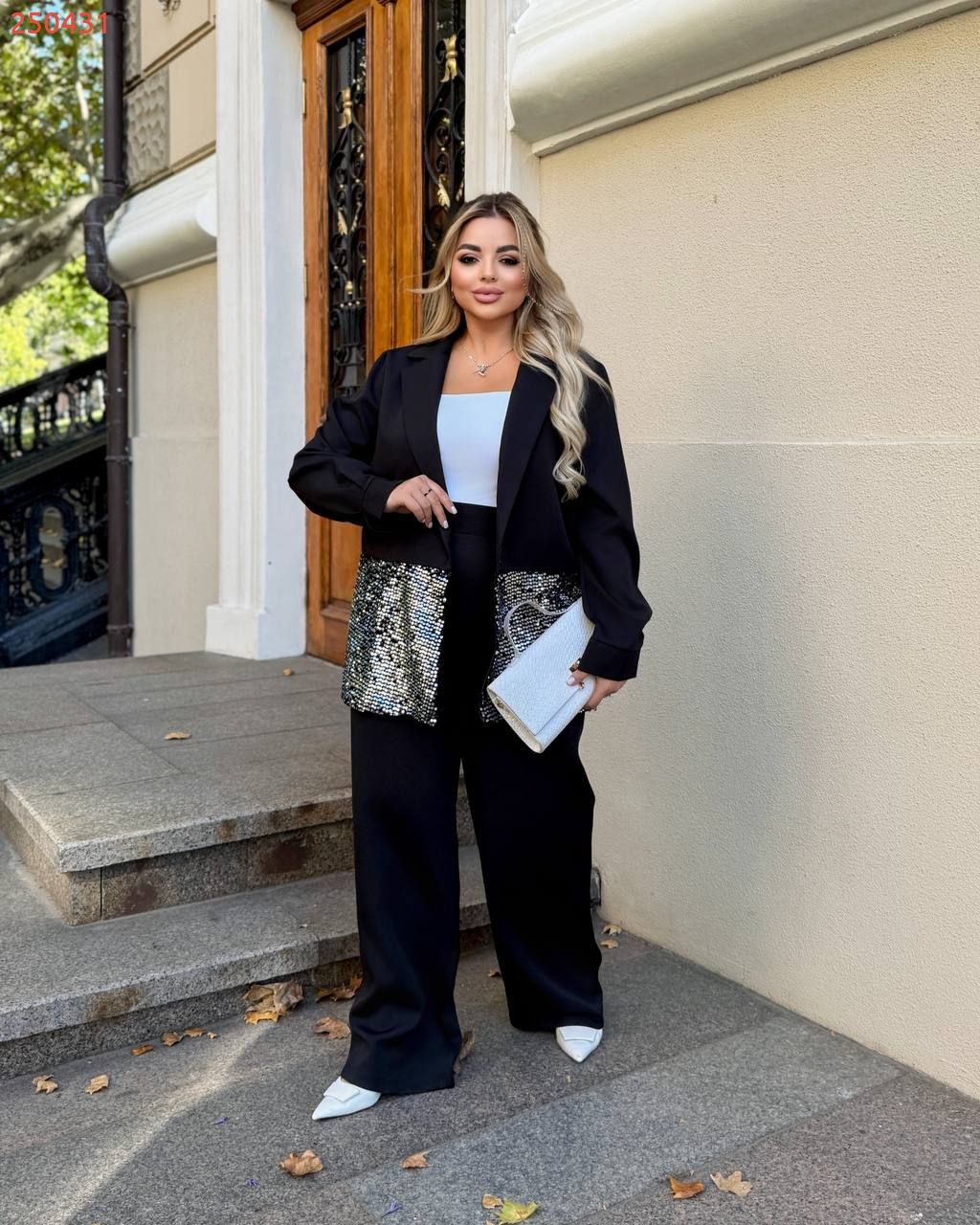 Стильний жіночий костюм .Подовжений піджак, прямого крою, з класичним коміром .Широкі штани. Цей костюм відмінно підійде для повсякденних, ділових та стильних образів, святкових вечорів