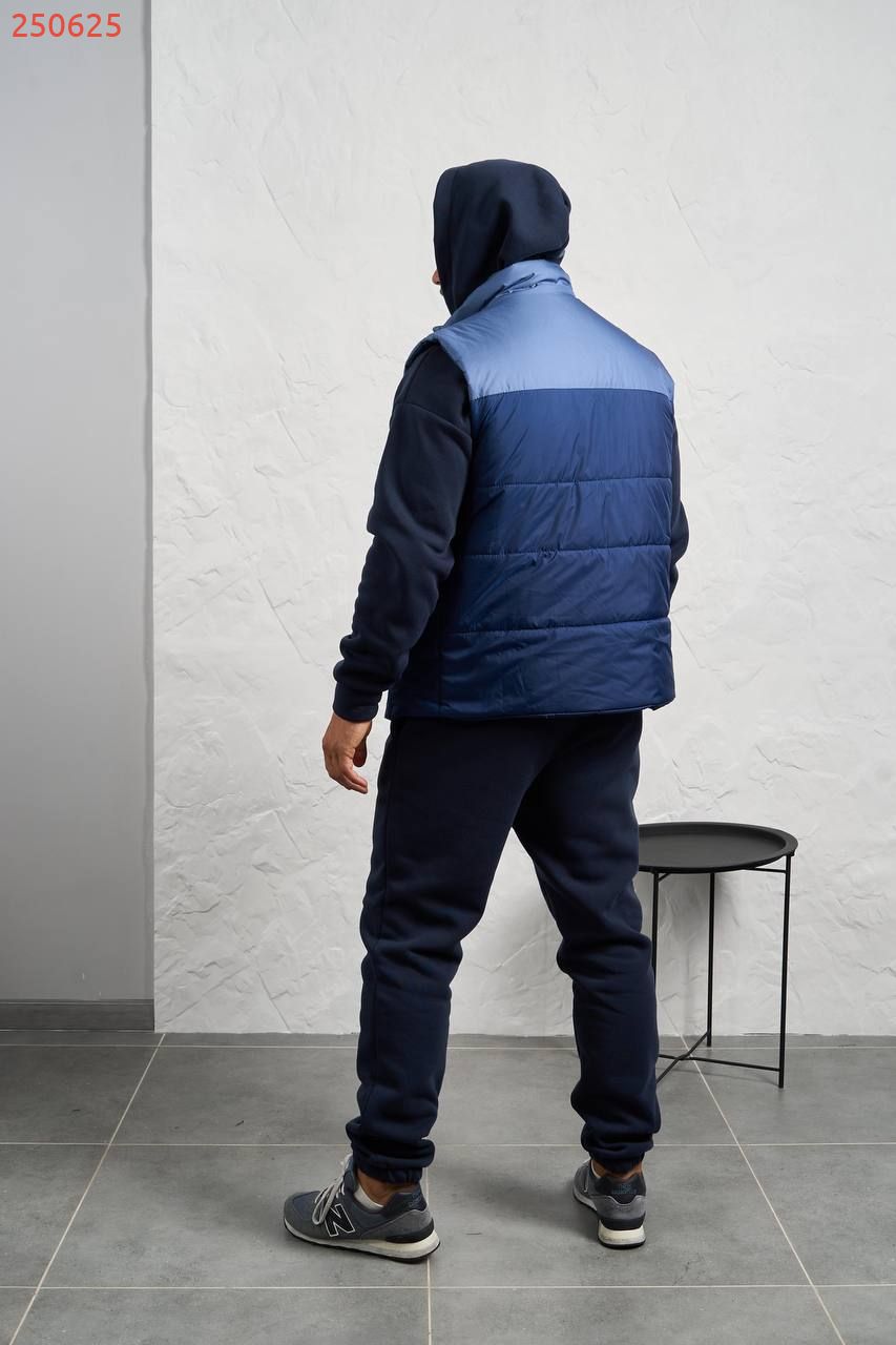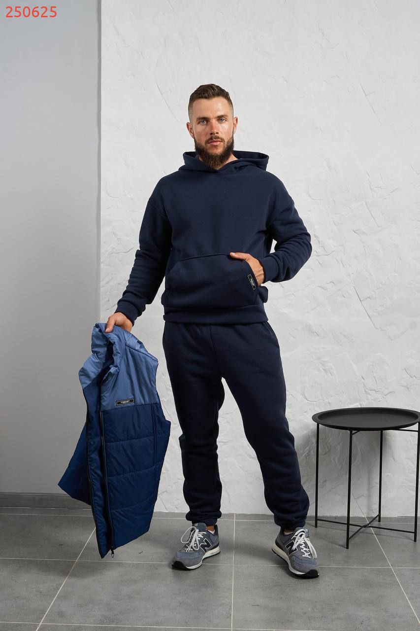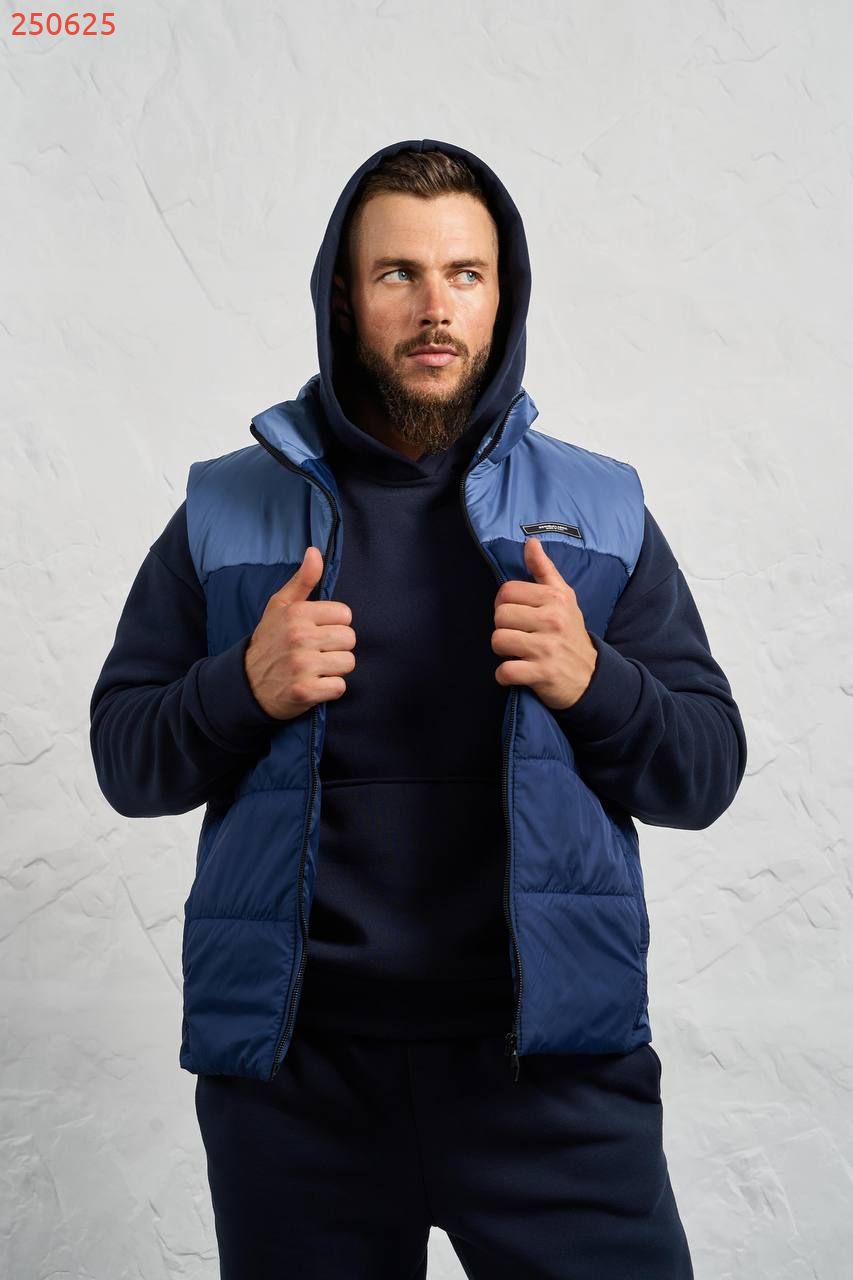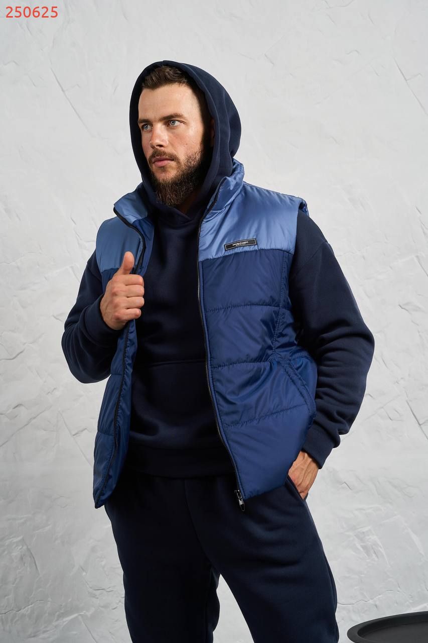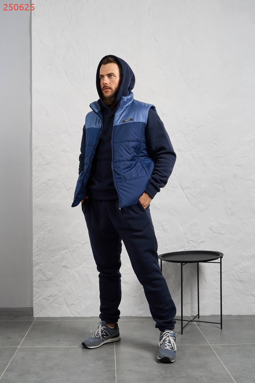 Стильний чоловічий комплект для прохолодної погоди. Складається з утепленого жилета та зручного бтеплого спортивного костюма, з кишенею кенгуру, збоку прикрашен нашивкою, з капюшоном. Рукава на манжетах. Штани прямі, висока посадка з кишенями, і знизу на гумці. Жилет