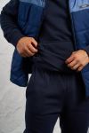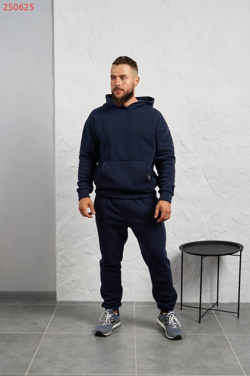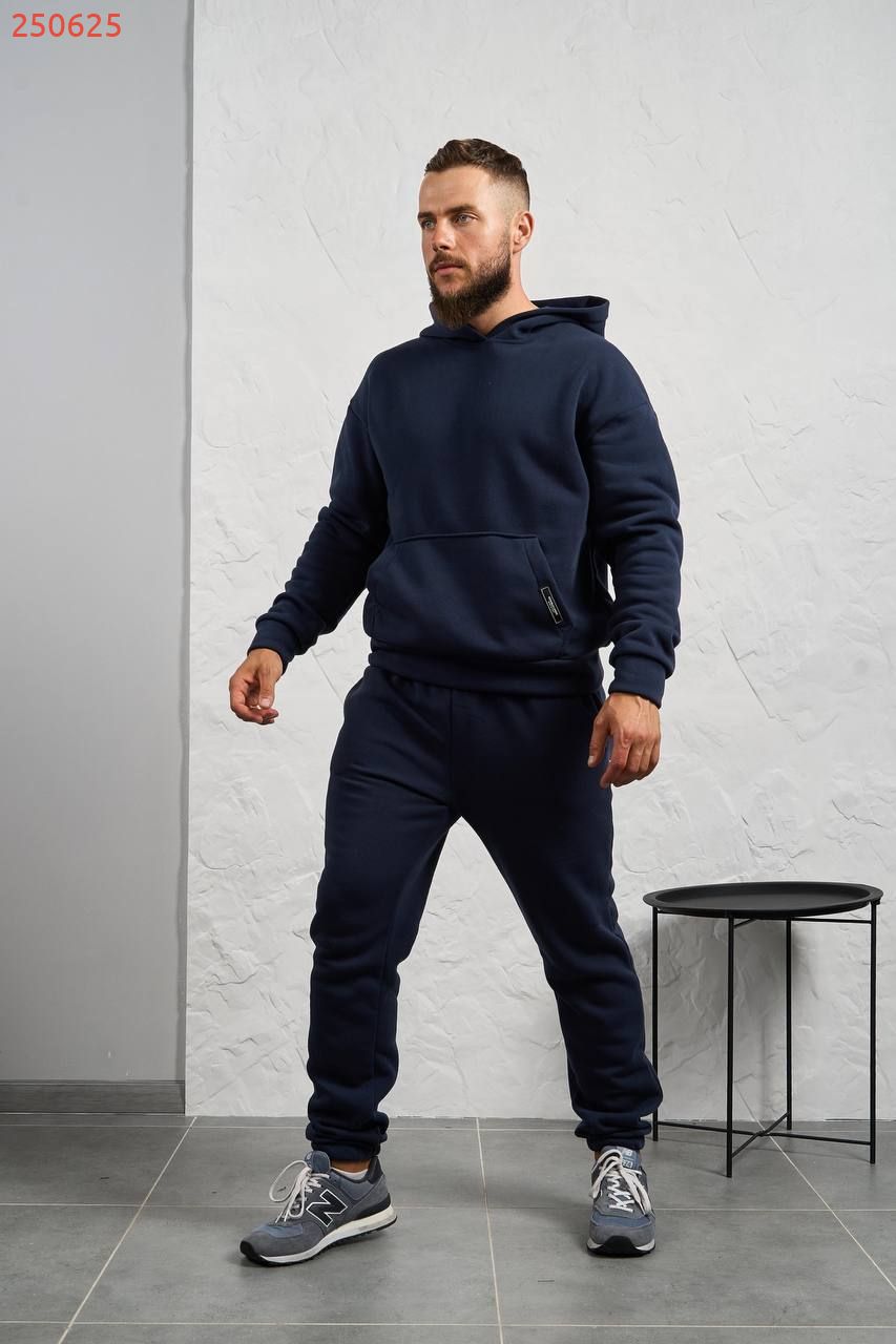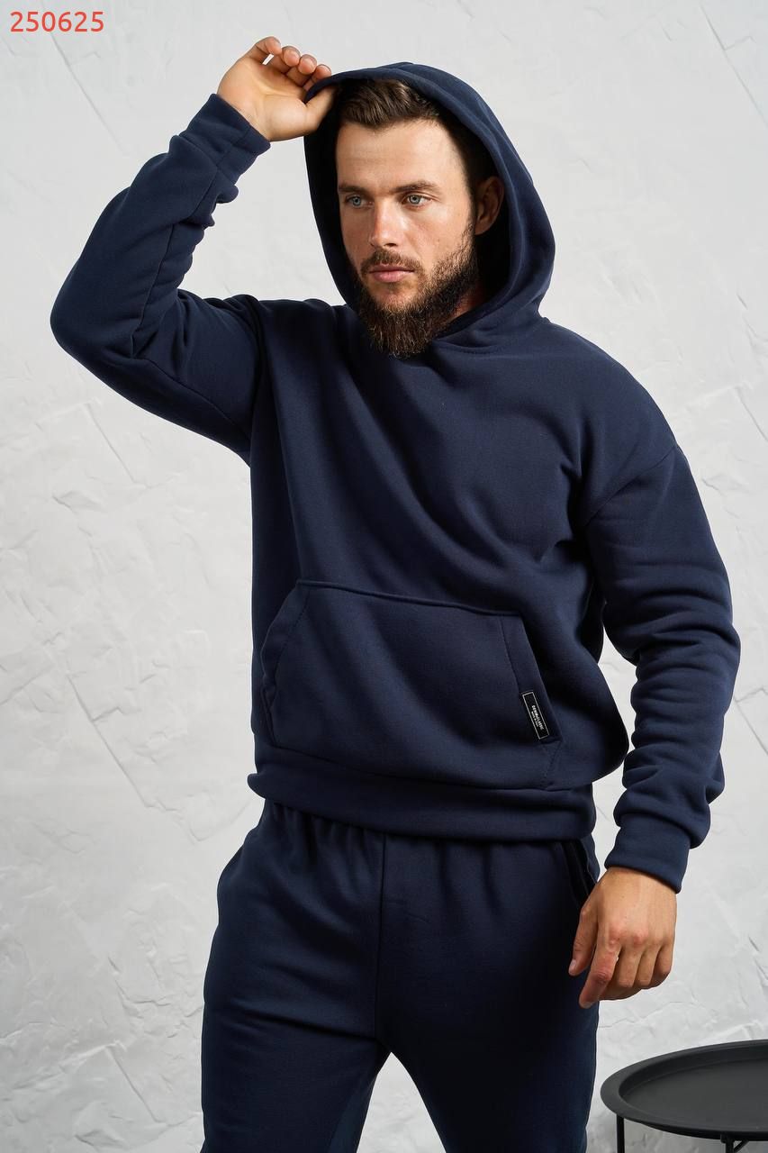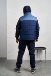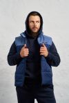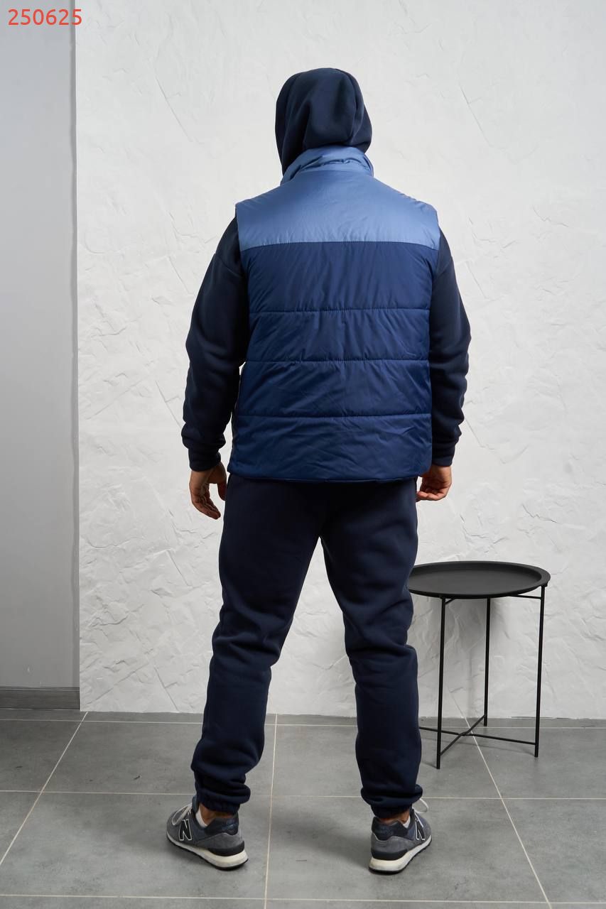 Стильний чоловічий комплект для прохолодної погоди. Складається з утепленого жилета та зручного бтеплого спортивного костюма, з кишенею кенгуру, збоку прикрашен нашивкою, з капюшоном. Рукава на манжетах. Штани прямі, висока посадка з кишенями, і знизу на гумці. Жилет