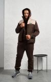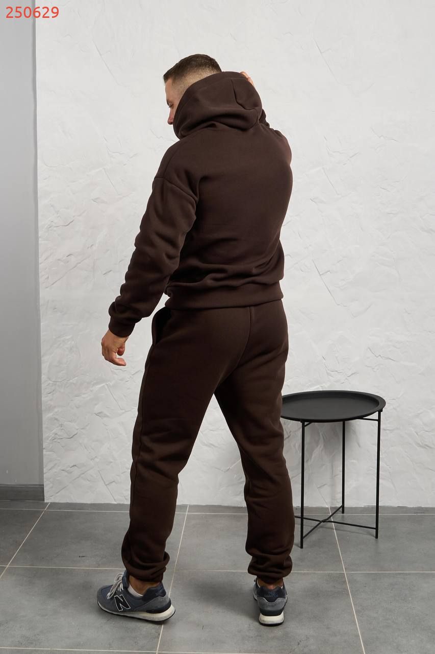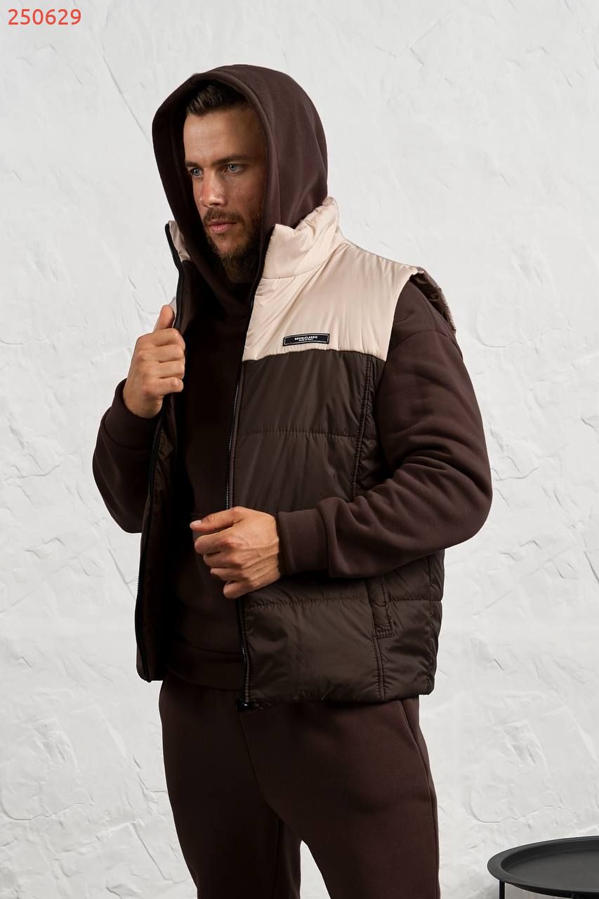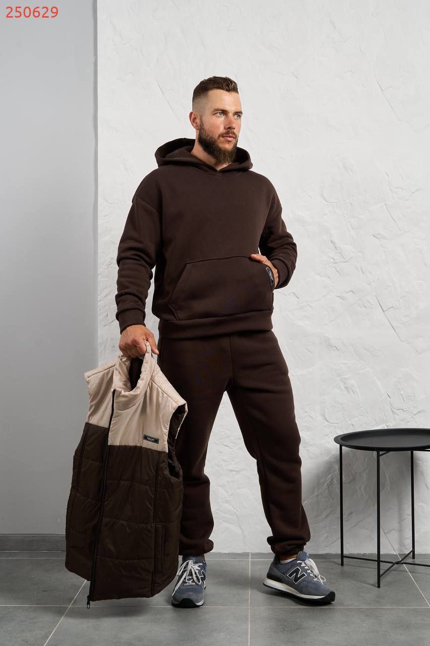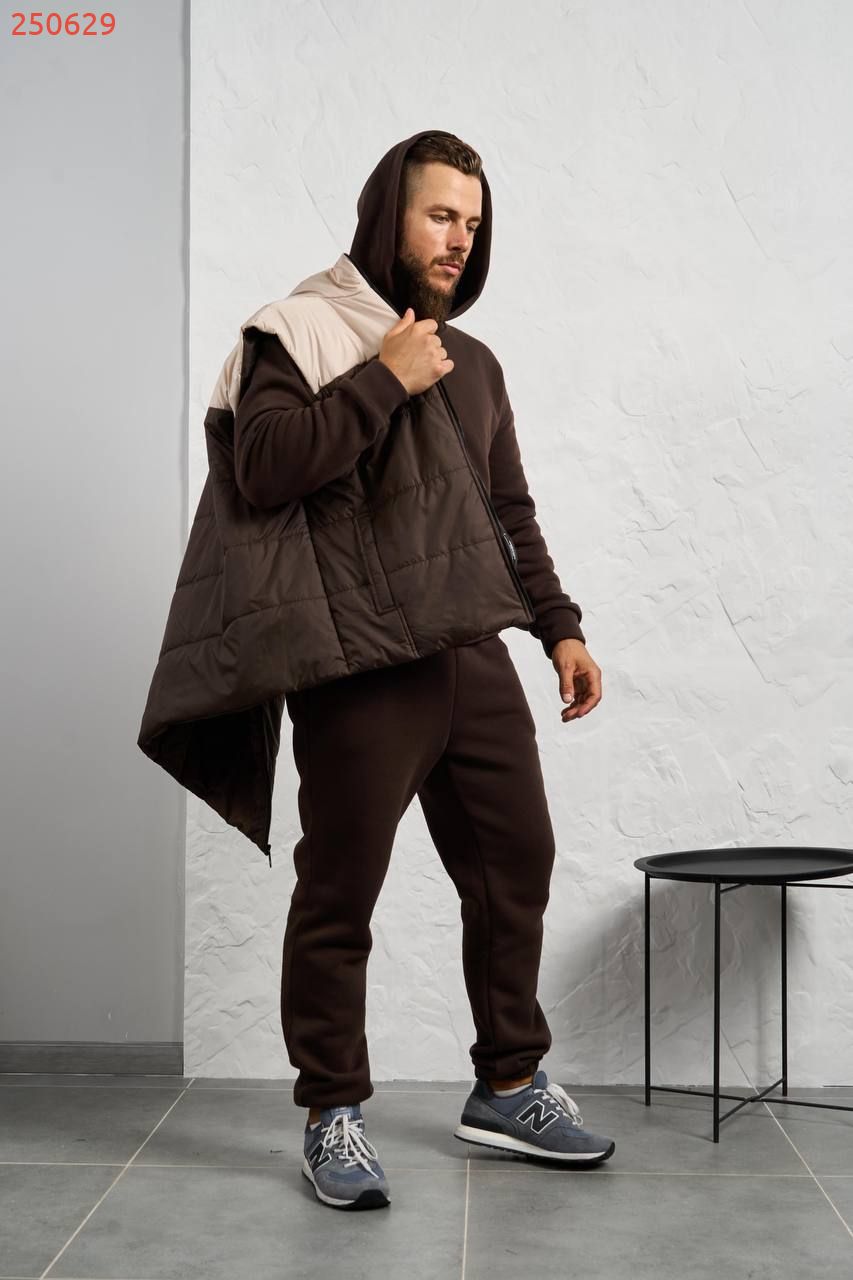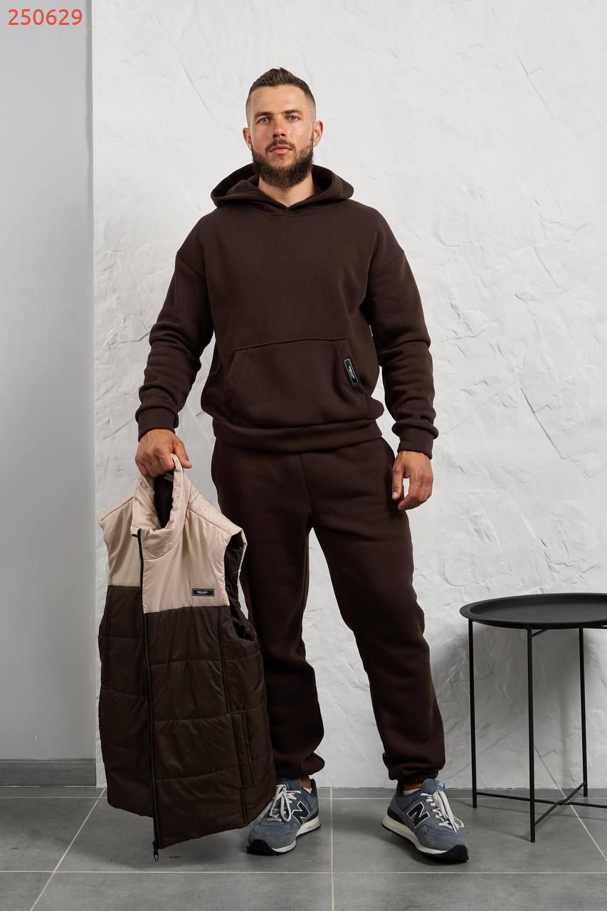 Стильний чоловічий комплект для прохолодної погоди. Складається з утепленого жилета та зручного бтеплого спортивного костюма, з кишенею кенгуру, збоку прикрашен нашивкою, з капюшоном. Рукава на манжетах. Штани прямі, висока посадка з кишенями, і знизу на гумці. Жилет