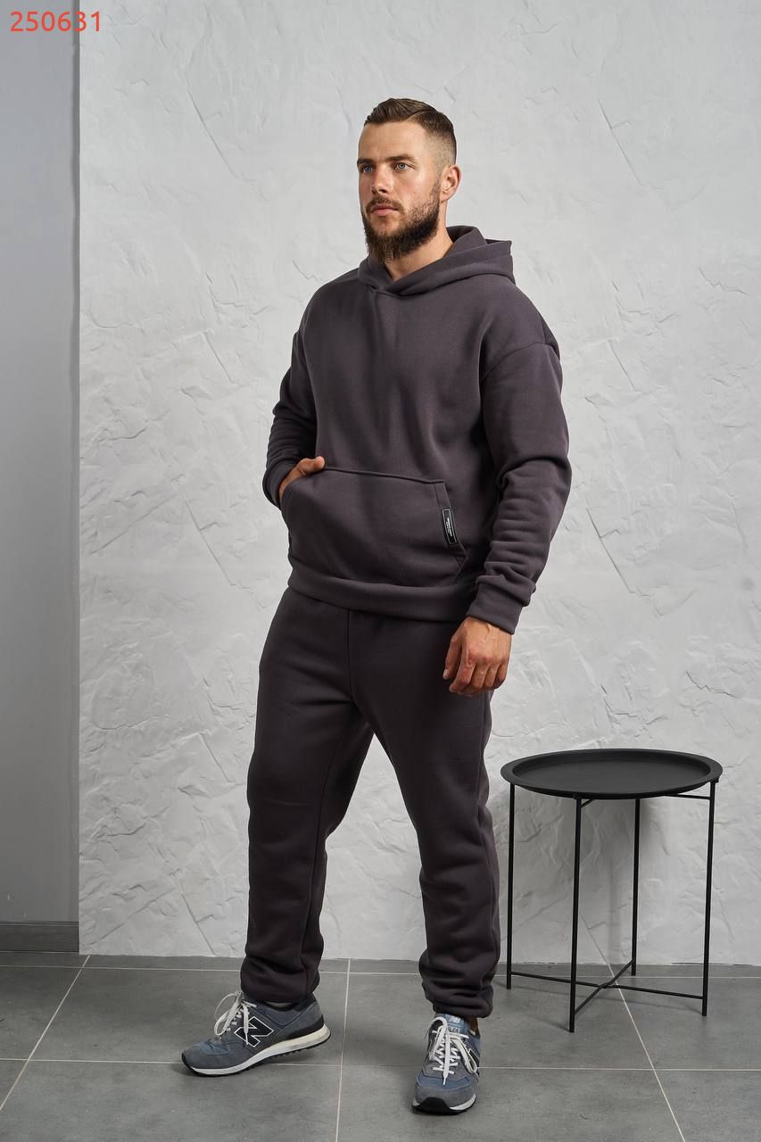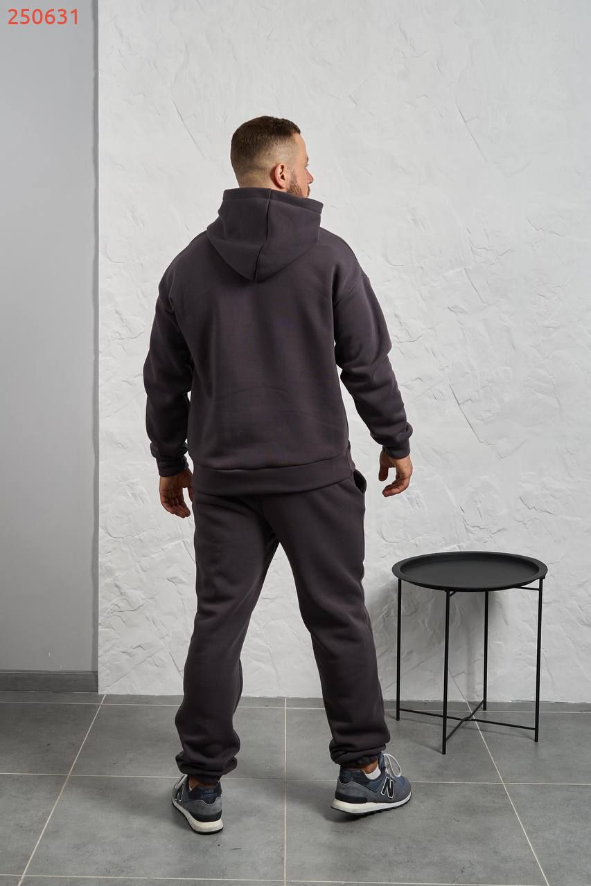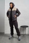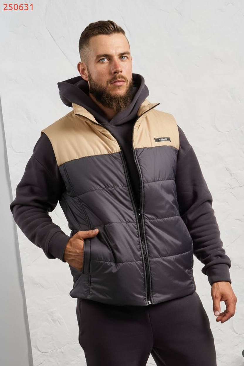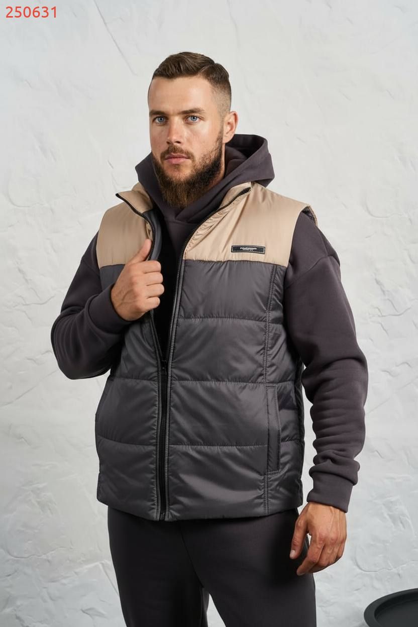 Стильний чоловічий комплект для прохолодної погоди. Складається з утепленого жилета та зручного бтеплого спортивного костюма, з кишенею кенгуру, збоку прикрашен нашивкою, з капюшоном. Рукава на манжетах. Штани прямі, висока посадка з кишенями, і знизу на гумці. Жилет