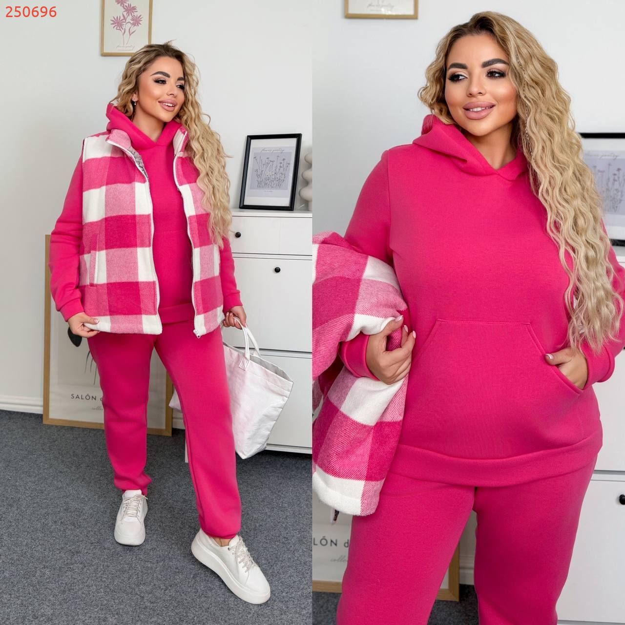 Худі на манжеті , з капюшоном , кишеня кенгуру . Штани з високою посадкою на гумці , з бічними кишенями , низ на манжеті .
