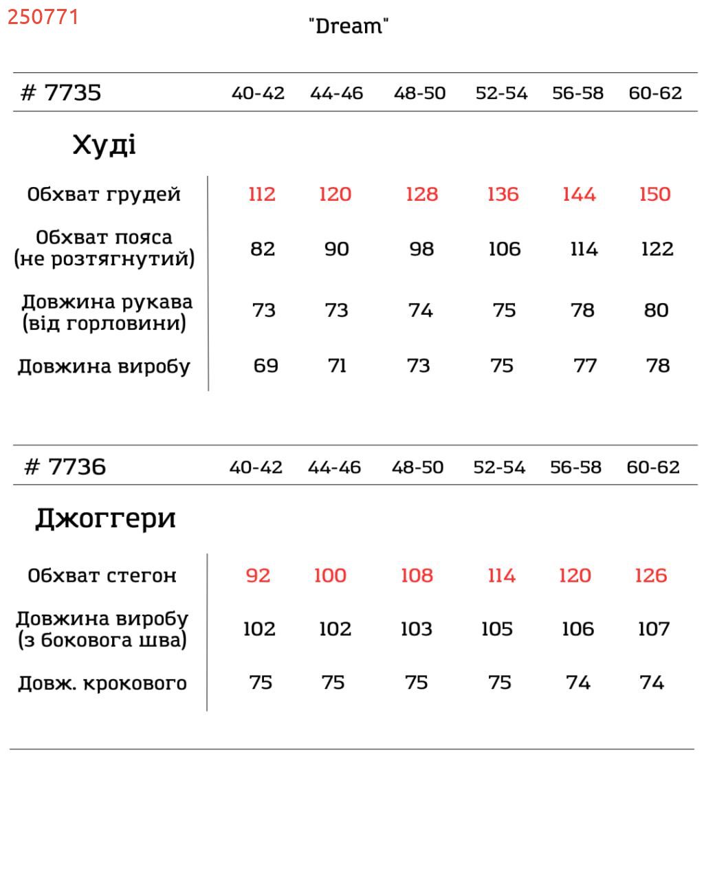 Зріст 171 см, ОГ 113, ОС 117. Розмір худі та джоггерів - 52-54.