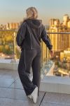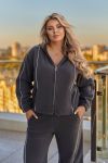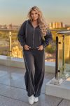 Кофта на блискавці з капюшоном вільного прямого крою, зручні кишені по боках, по низу на резинці з фіксатором,для коригування потрібного обʼєму і довжини. Кофта спереду і ззаду прикрашена кантом. Штани з кишенями, вільні,знизу на резинці з фіксацію, можна затягнути, по боках- подвійний лампас.