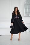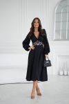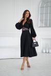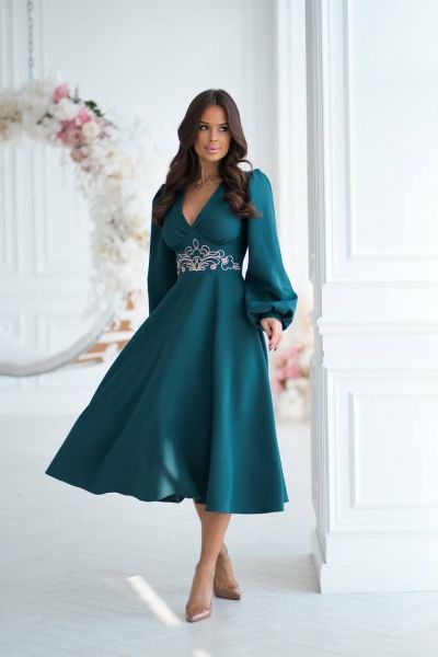 Вишукана сукня довжини міді з контрастною вишивкою на талії. Глибокий V-подібний виріз візуально подовжує шию та додає образу нотку романтичності, а довгі рукави з легким об’ємом надають м'якості та плавності лініям.