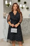 Елегантне жіноче плаття, виконане з кріп дайвінгу (тягнеться) і сітки з блиском. Перед сукні з імітацією запаху. До сукні додається знімний пояс із основної тканини. У такій сукні будь-яка жінка зможе відчути себе справжньої леді та королевою вечора, ця сукня здатна надати жінці ніжності, легкості та елегантності.