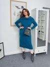 Модель має силует, що облягає, довжиною міді, підкреслюючи фігуру. Верх прикрашений оригінальним коміром-хомутом, який м'яко драпірується і надає образу жіночності та затишку. Рукави довгі, без манжет. Елегантний, але комфортний повсякденний образ у стилі casual chic.