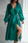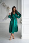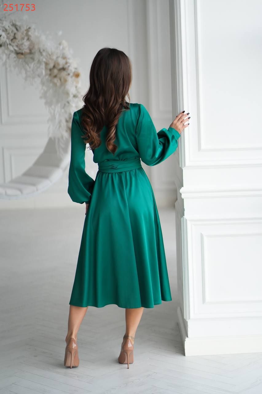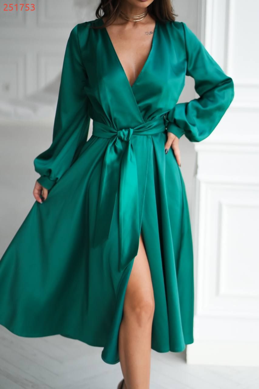 Довгі рукави з манжетами надають образу ніжності, а струмлива тканина красиво грає на світлі, створюючи ефект дорогоцінного шовку.