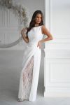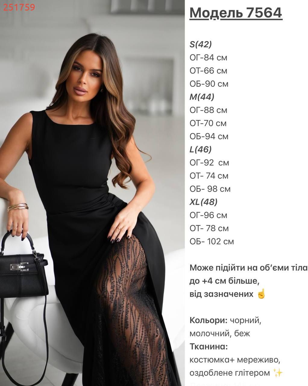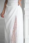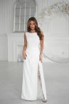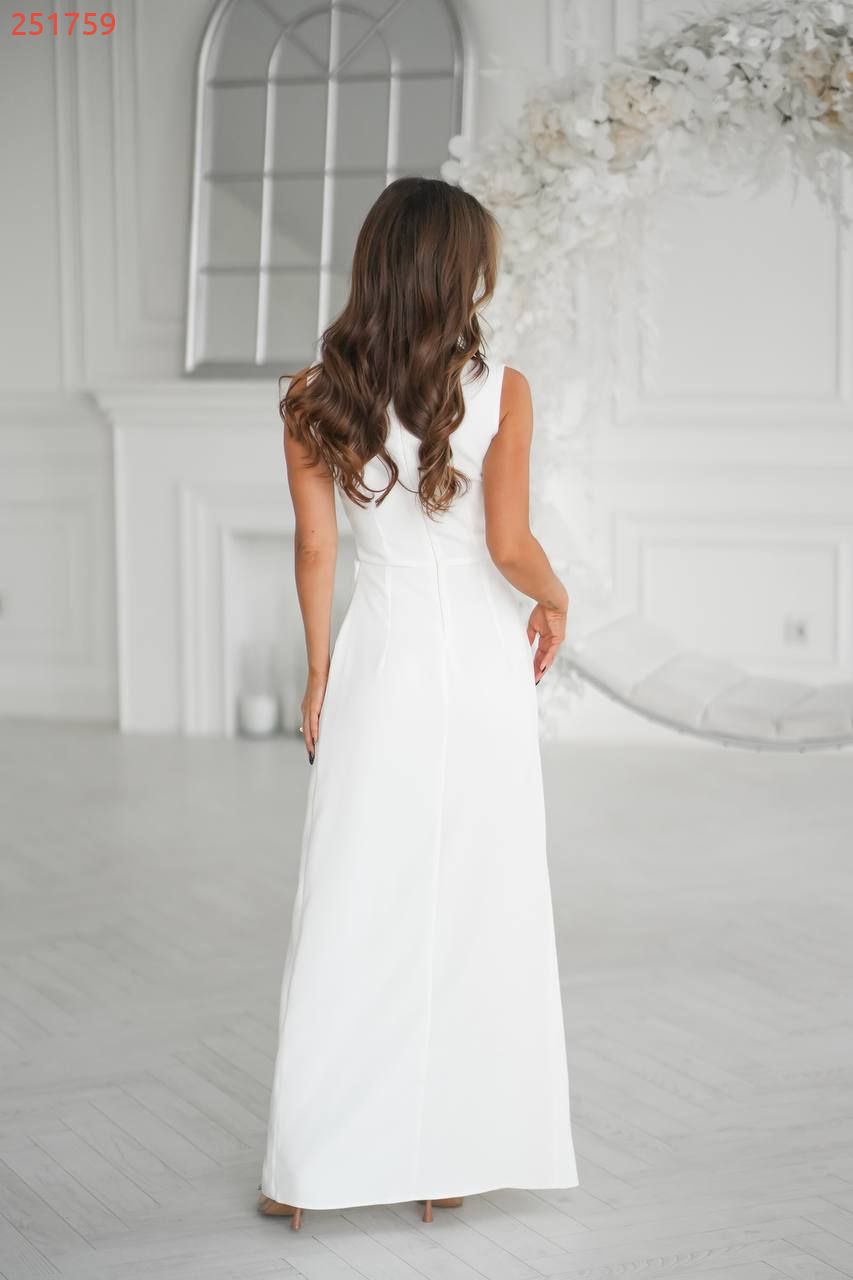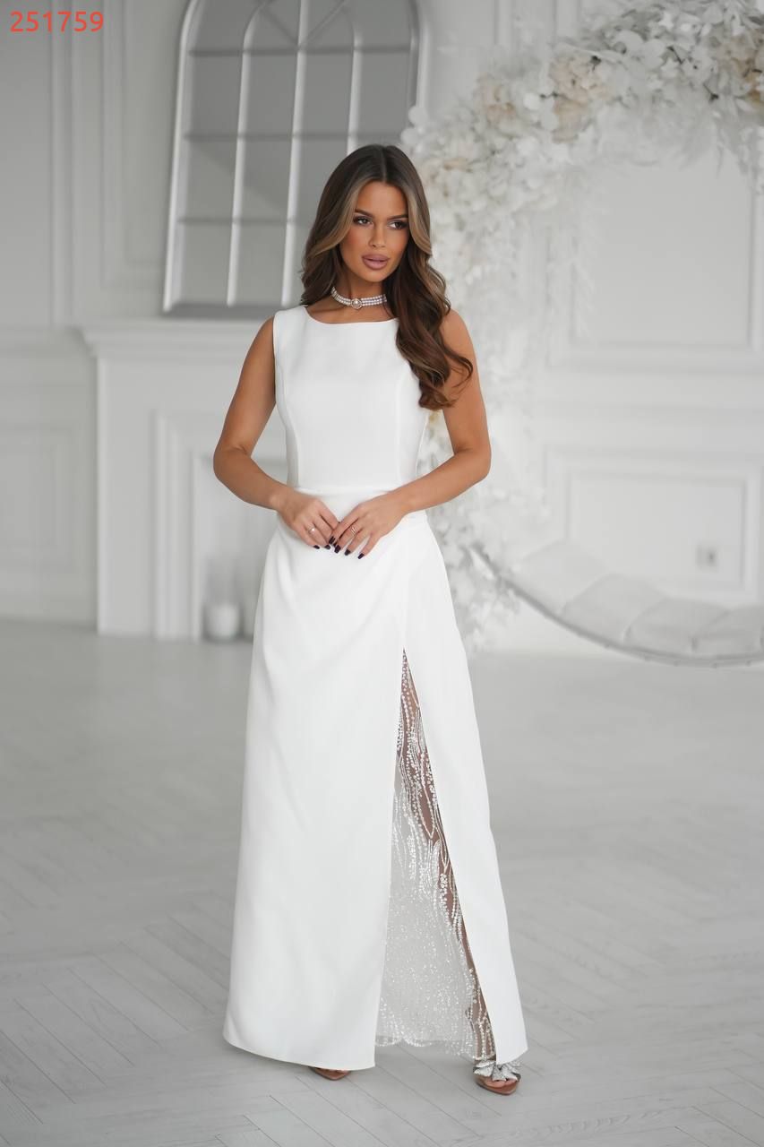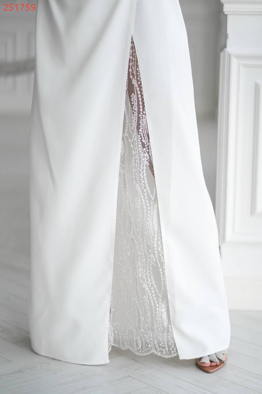 Має прямий силует, витончену драпіровку на талії та високий розріз, що додає образу жіночності й шарму.