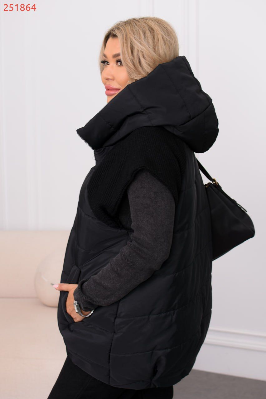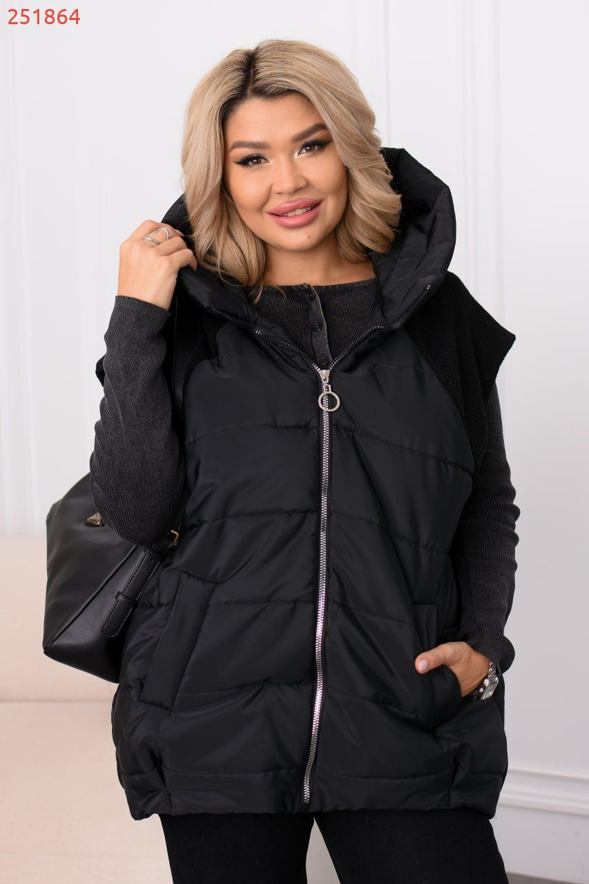 Комфортна жилетка з плащівки Еммі на підкладці, утеплена силіконом 150 г/м² – легка й тепла на щодень. Трикотажні рукави додають затишку, а стьобана фактура тримає наповнювач рівномірно навіть після прання. Ідеальна для прохолоди. Має вшитий капюшон.