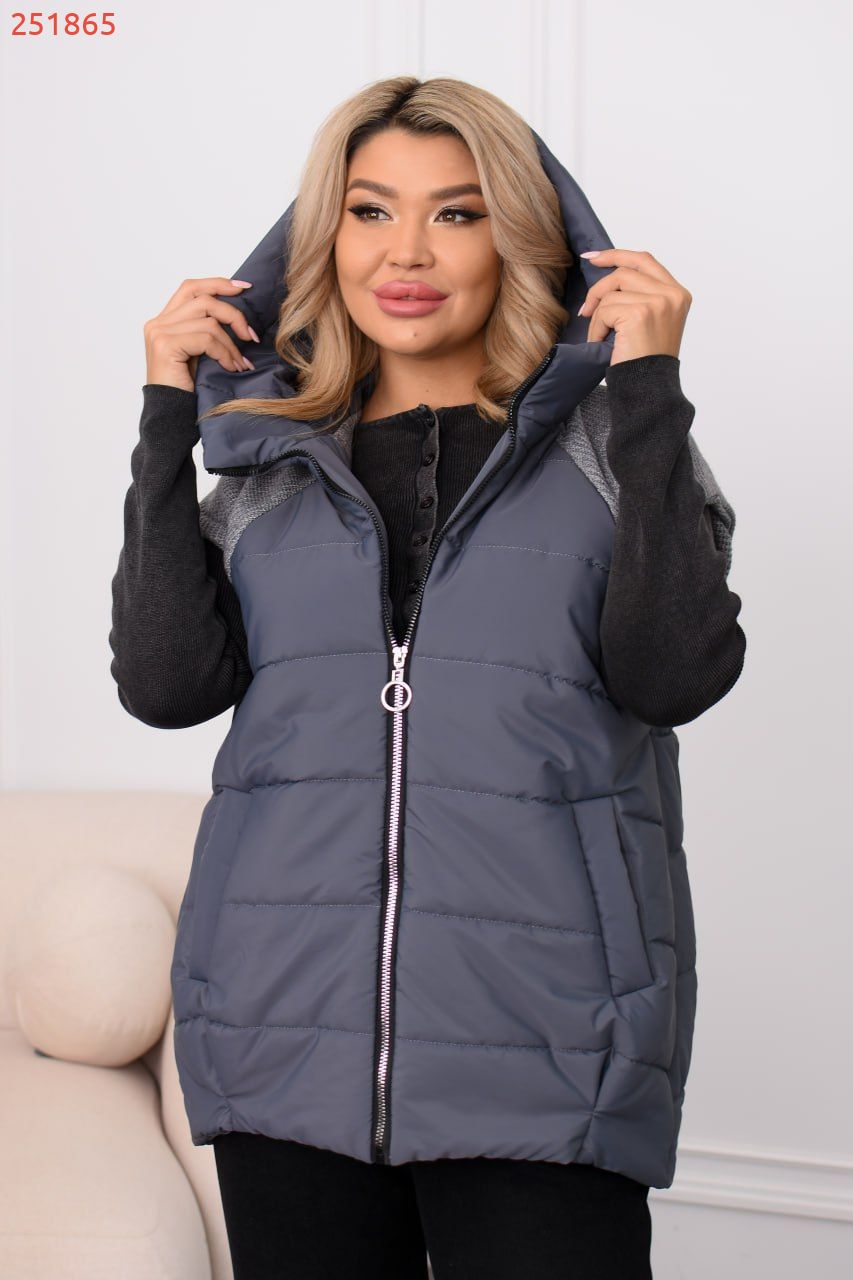 Комфортна жилетка з плащівки Еммі на підкладці, утеплена силіконом 150 г/м² – легка й тепла на щодень. Трикотажні рукави додають затишку, а стьобана фактура тримає наповнювач рівномірно навіть після прання. Ідеальна для прохолоди. Має вшитий капюшон.