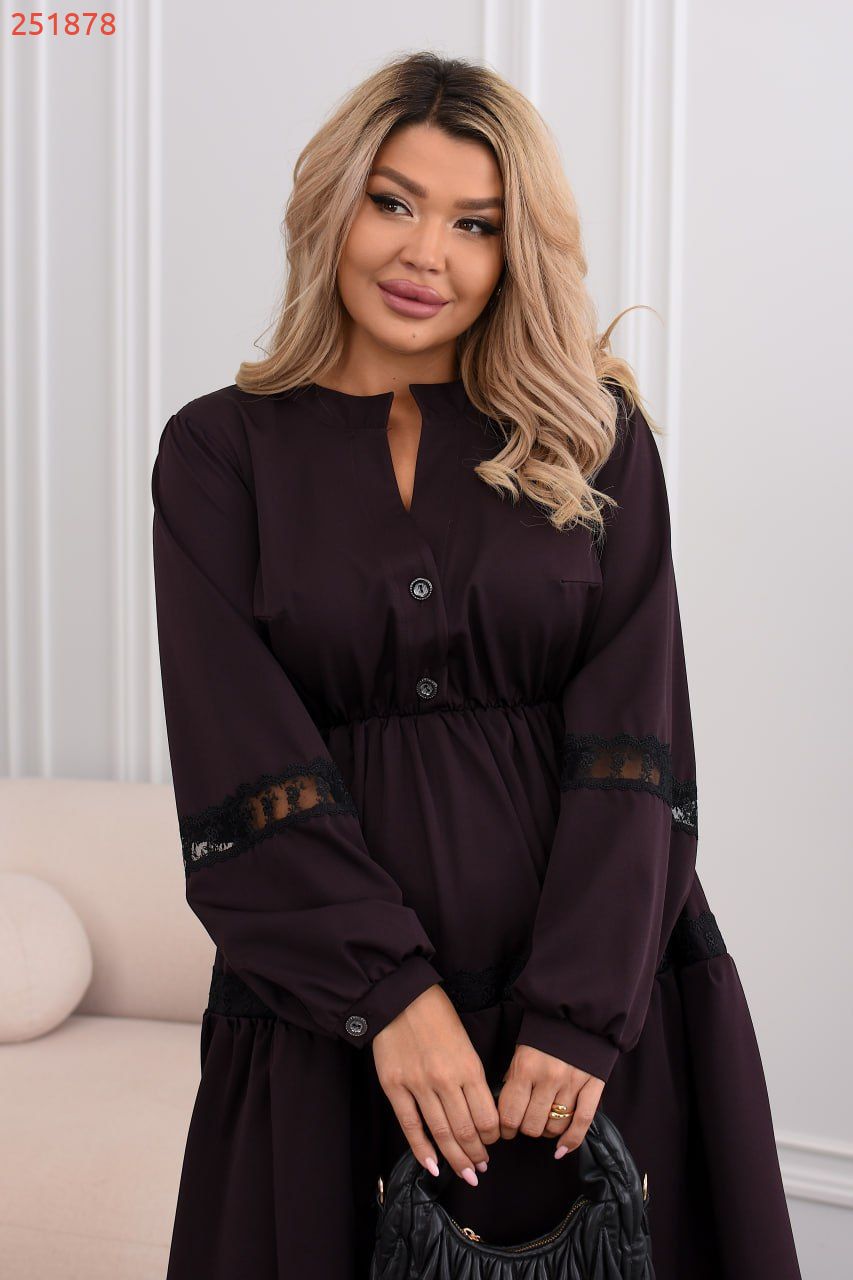Сукня вільного крою з застібкою на ґудзики до талії. По лінії талії – м’яка резинка для комфортної посадки. Декор із мережива додає ніжності, сукня пасує до кросівок і чобіт, легко комбінується на щодень і на свято.