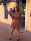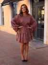 Сукня коротка, виконана з легкої, трохи блискучої тканини. Вільний фасон, з акцентом на талії завдяки поясу-стрічці. Довгі рукава, широкі, вільно спадають, надаючи образу романтичності та легкості. Зверху застібка на ґудзики спереду, що додає класичної нотки. Спідниця з двома ярусами воланів, які створюють об’єм та динаміку.