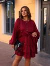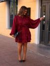 Сукня коротка, виконана з легкої, трохи блискучої тканини. Вільний фасон, з акцентом на талії завдяки поясу-стрічці. Довгі рукава, широкі, вільно спадають, надаючи образу романтичності та легкості. Зверху застібка на ґудзики спереду, що додає класичної нотки. Спідниця з двома ярусами воланів, які створюють об’єм та динаміку.