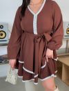 Ця стильна сукня з воланами і декоративними білими вставками стане чудовим вибором для будь-якого випадку. Вона має вільний крій, що підкреслює комфорт та легкість. Оригінальні рюші на плечах додають образу романтичності, а білі мереживні акценти по краю надають сукні витонченого вигляду. Довжина сукні вище коліна, що робить її ідеальним варіантом як для повсякденних прогулянок, так і для особливих подій. Поєднується як з класичними туфлями, так і з більш зручним взуттям.