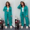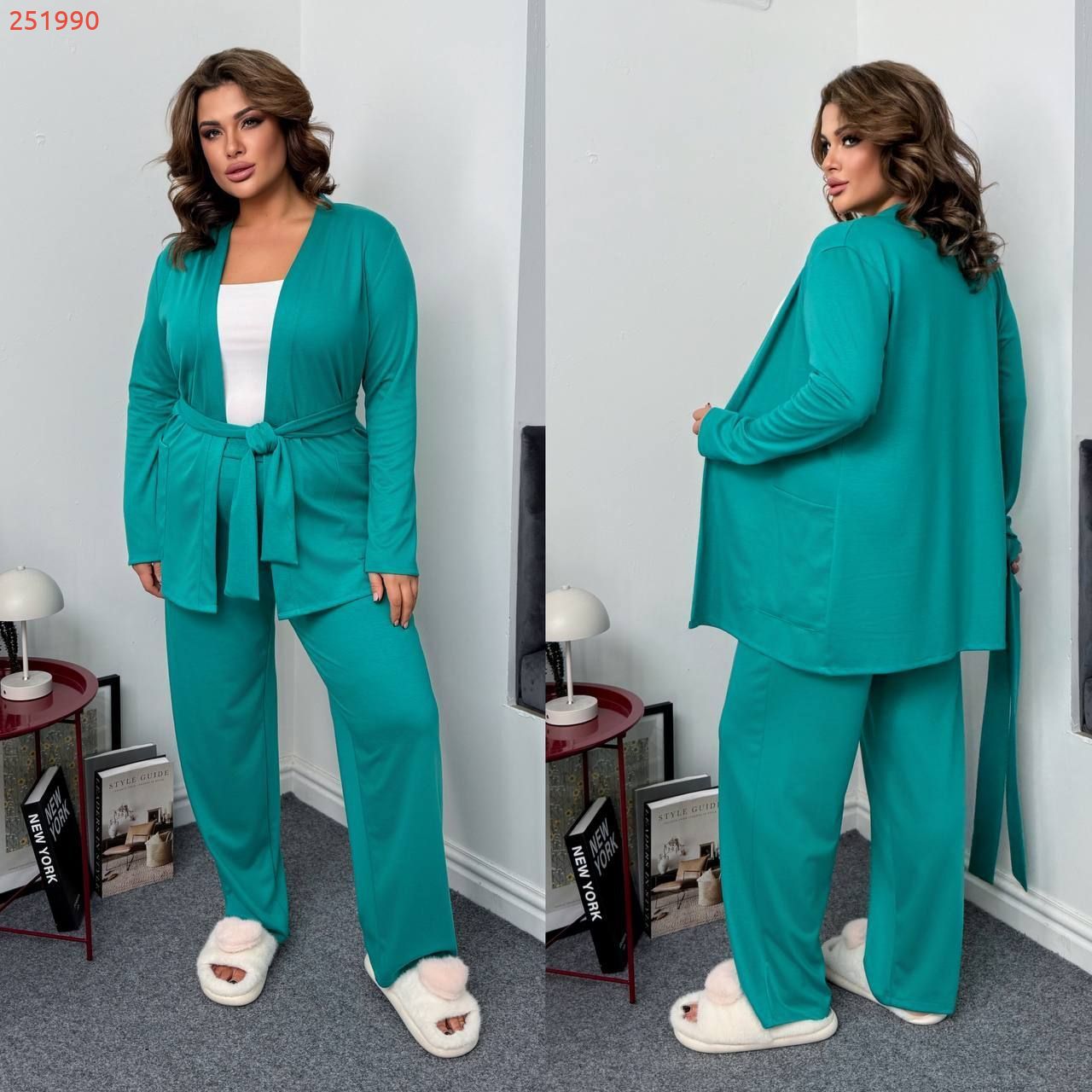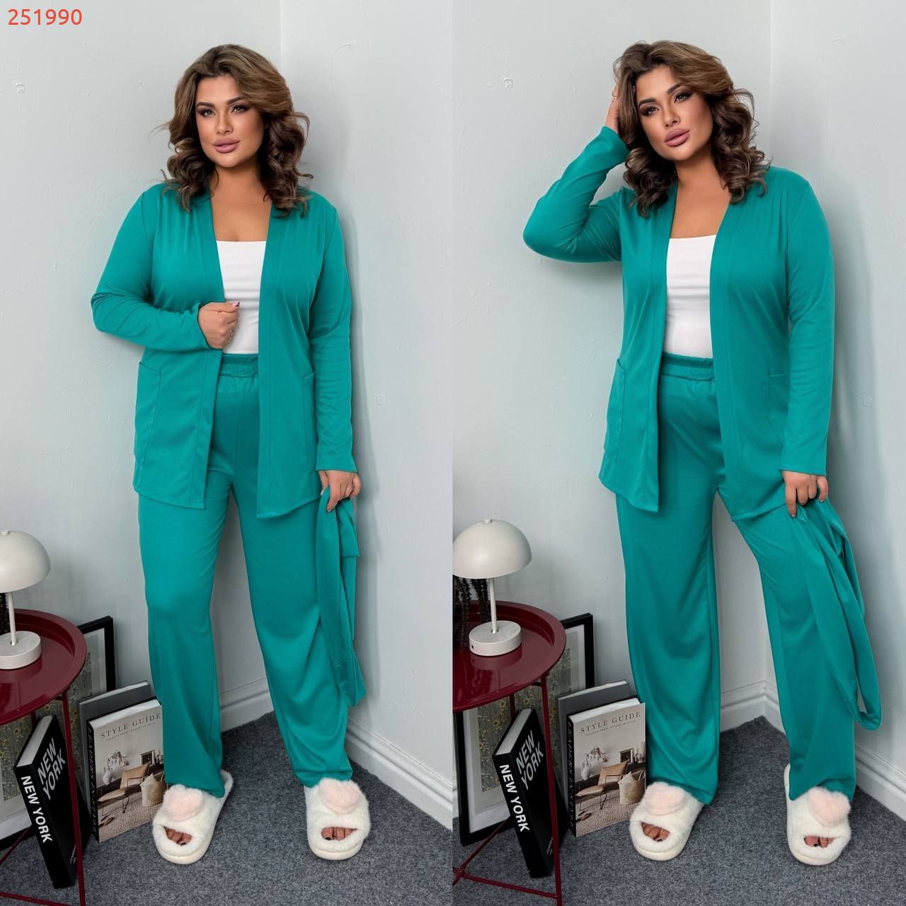 Штани з високою посадкою , пояс на гумці . Халат прямого покрою , з кишенями , та поясом .