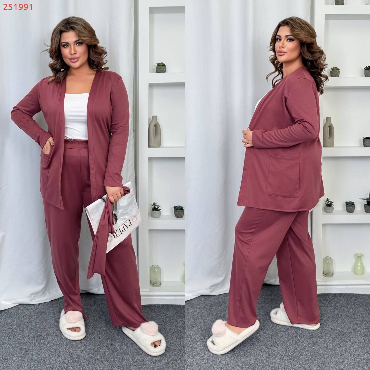 Штани з високою посадкою , пояс на гумці . Халат прямого покрою , з кишенями , та поясом .