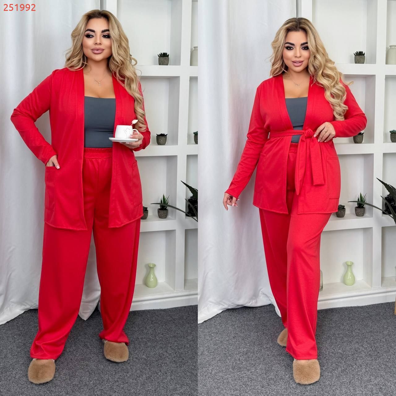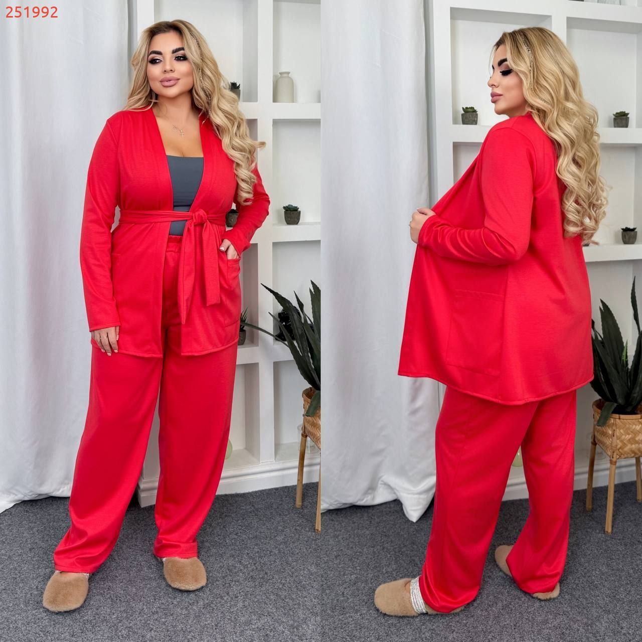 Штани з високою посадкою , пояс на гумці . Халат прямого покрою , з кишенями , та поясом .