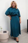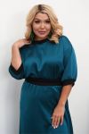 Талія підкреслена тонким чорним ременем, створюючи жіночний силует. Спідниця, що струмує, довжиною нижче коліна, що робить образ витонченим і елегантним.