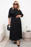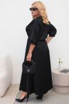 Талія підкреслена тонким чорним ременем, створюючи жіночний силует. Спідниця, що струмує, довжиною нижче коліна, що робить образ витонченим і елегантним.