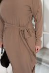 Мінімалістична жіночна сукня, виконана з м'якої ангорової тканини, здатна надати силуету вашої фігури м'якості і природності. Модель прямого силуету доповнена довгими рукавами "реглан" з манжетами, а також фігурним вирізом збоку внизу і трохи асиметричним низом, подовженим спереду. Родзинкою цієї сукні є текстильний пояс, вшитий в бокові шви, за допомогою якого ви можете змінювати свій образ, зав'язуючи його спереду або ззаду.