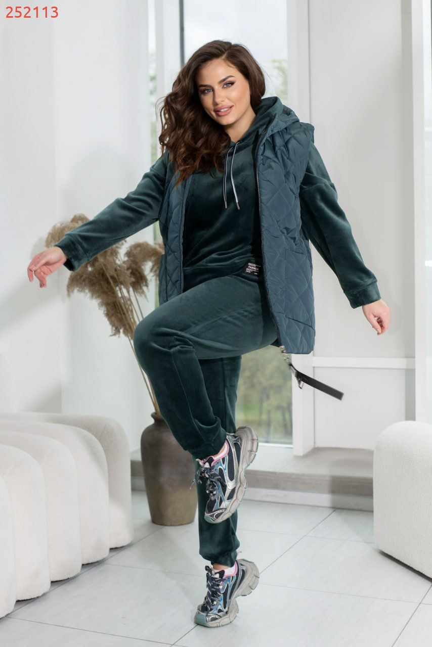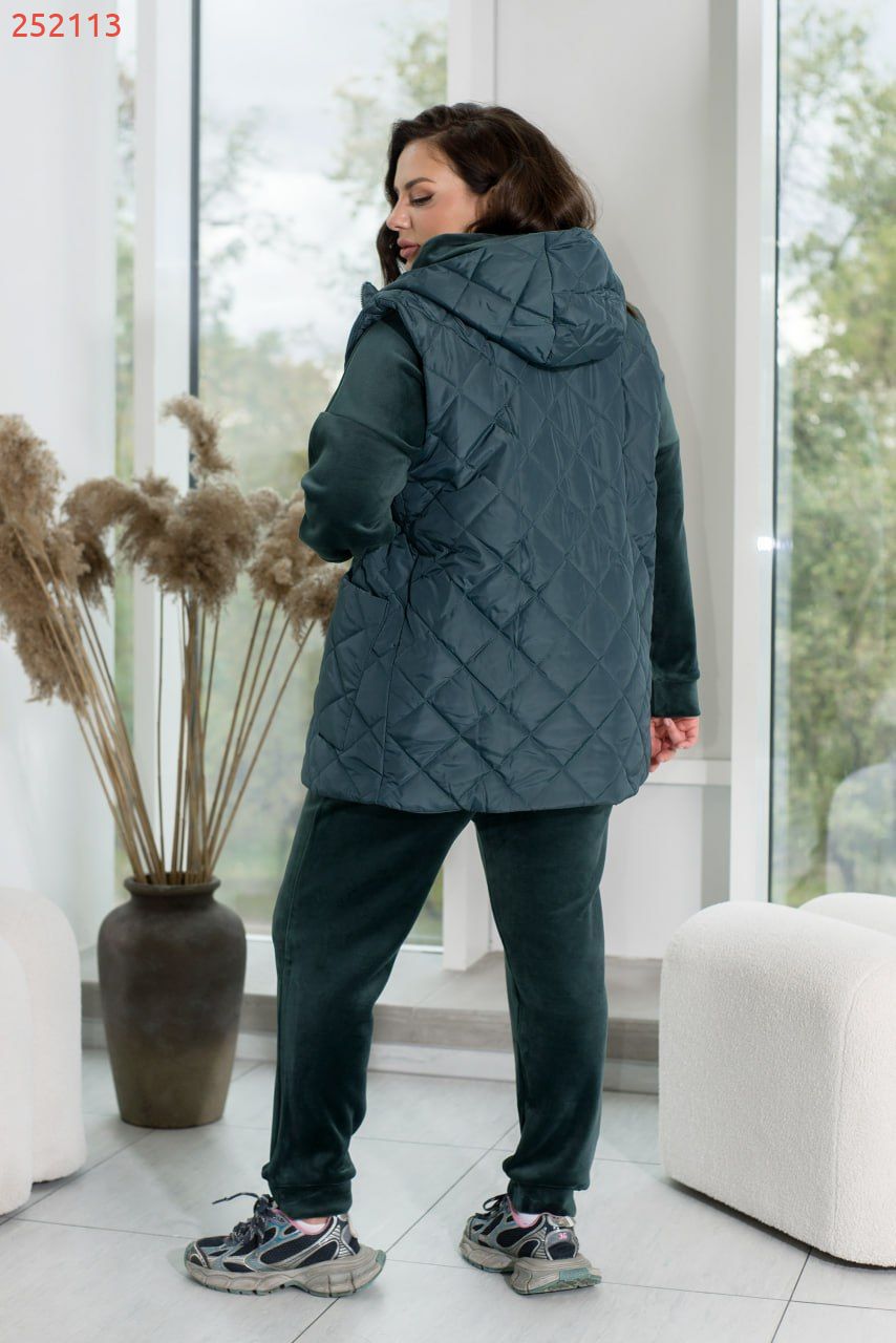 Зустрічайте наш універсальний костюм трійка, створений для стильних і зручних образів у прохолодну погоду. Комплект складається з жилетки з капюшоном та накладними кишенями, кофти зі спущеними рукавами та капюшоном зі шнурком, а також прямих штанів з середньою посадкою і кишенями по боках.Жилетка додає практичності та стилю завдяки капюшону і накладним кишеням. Кофта з капюшоном і спущеними рукавами створює невимушений і затишний образ. Прямі штани з середньою посадкою забезпечують комфорт і стиль. Вони практичні завдяки кишеням по боках і низу на резинці. Цей костюм – вибір активних жінок, які цінують якість і стиль.Ідеальний варіант, для жінок, які поспішають та полюбляють бути в комфорті. Доповніть образ кросівками чи об'ємними чоботями