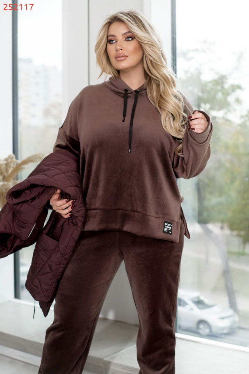 Зустрічайте наш універсальний костюм трійка, створений для стильних і зручних образів у прохолодну погоду. Комплект складається з жилетки з капюшоном та накладними кишенями, кофти зі спущеними рукавами та капюшоном зі шнурком, а також прямих штанів з середньою посадкою і кишенями по боках.Жилетка додає практичності та стилю завдяки капюшону і накладним кишеням. Кофта з капюшоном і спущеними рукавами створює невимушений і затишний образ. Прямі штани з середньою посадкою забезпечують комфорт і стиль. Вони практичні завдяки кишеням по боках і низу на резинці. Цей костюм – вибір активних жінок, які цінують якість і стиль.Ідеальний варіант, для жінок, які поспішають та полюбляють бути в комфорті. Доповніть образ кросівками чи об'ємними чоботями