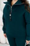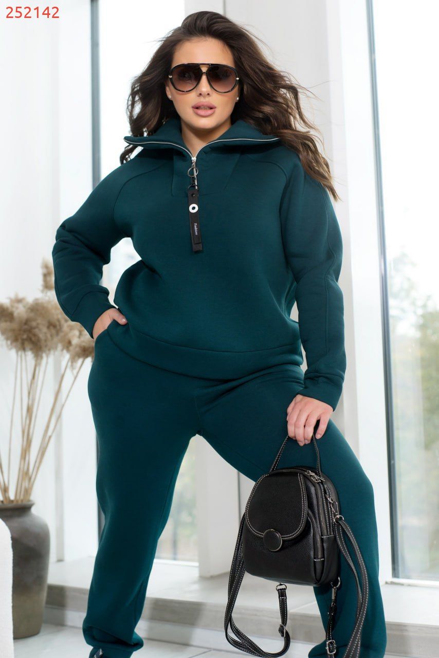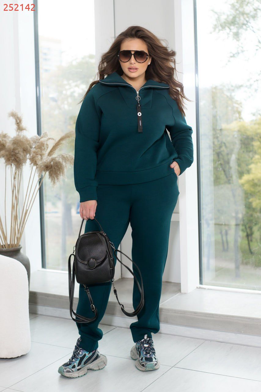 Спортивний костюм із трьохнитки на флісі забезпечує ідеальне поєднання тепла та комфорту в прохолодну погоду. Худі має зручну змійку і високу горловину, що ефективно захищає шию від холоду. Довгі рукави з манжетами забезпечують комфортну посадку та зберігають тепло. Штани з високою посадкою на еластичній гумці підкреслюють фігуру та забезпечують максимальну свободу рухів. Манжети внизу штанів додають стильного вигляду та додаткового тепла. Бокові кишені роблять костюм практичним і зручним для щоденного носіння або активного відпочинку.