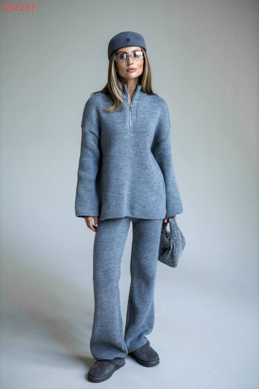 Затишний костюм із м'якої щільної пряжі з ідеальною посадкою. Вільний светр на блискавці та прямі штани створюють стильний та розслаблений силует. Підходить для міста, подорожей та відпочинку.