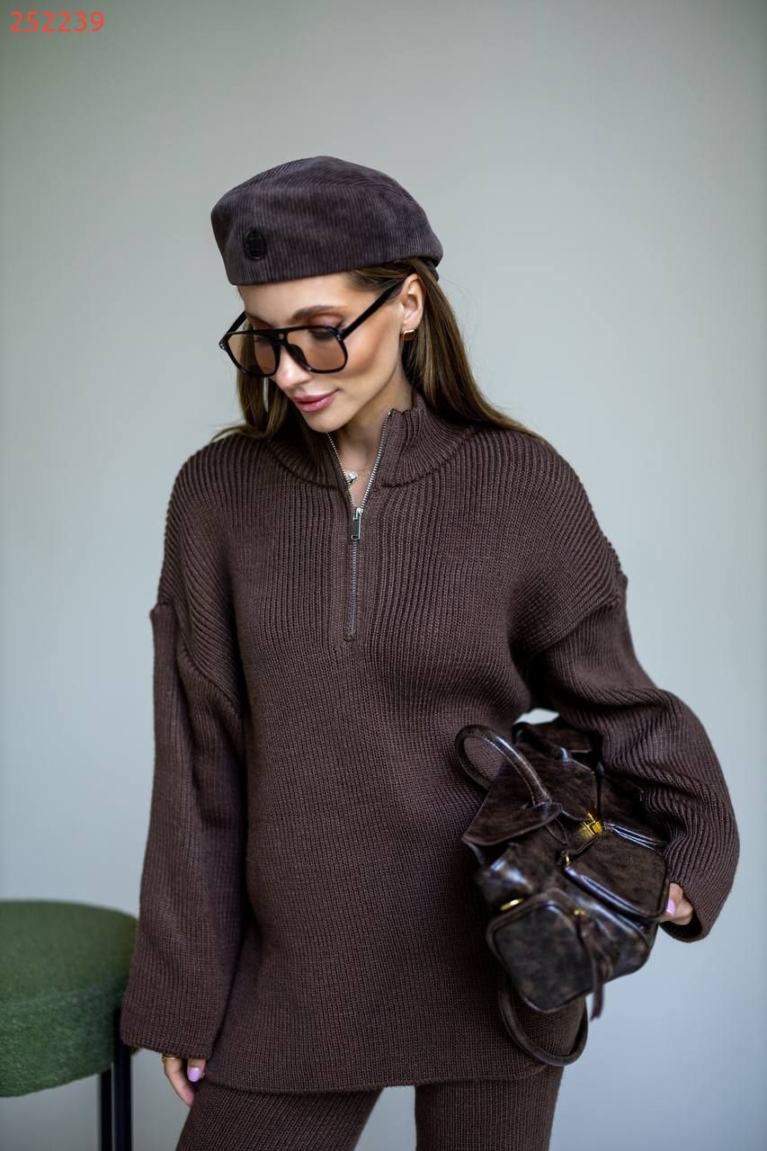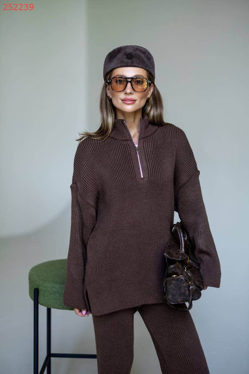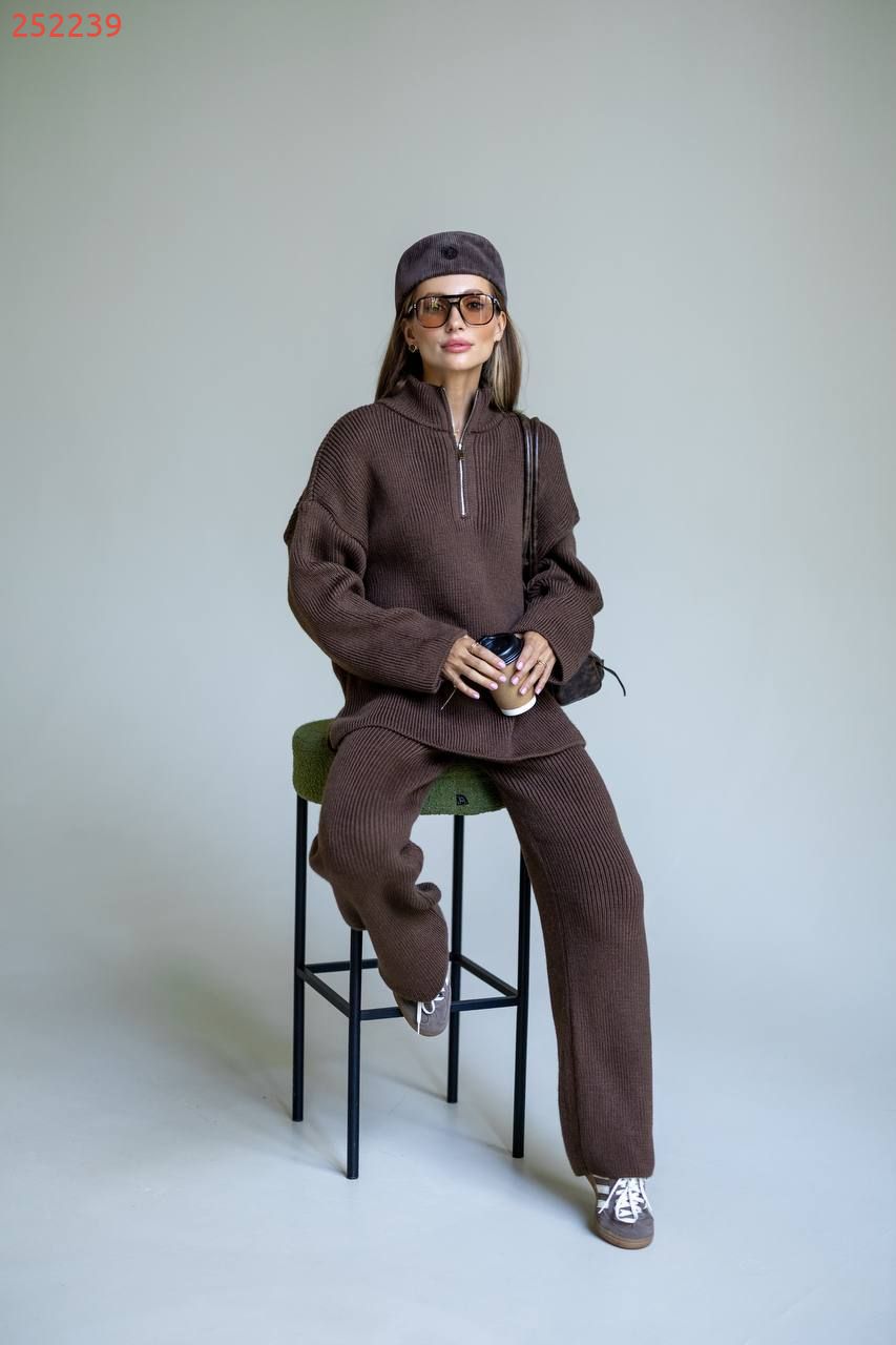 Затишний костюм із м'якої щільної пряжі з ідеальною посадкою. Вільний светр на блискавці та прямі штани створюють стильний та розслаблений силует. Підходить для міста, подорожей та відпочинку.