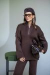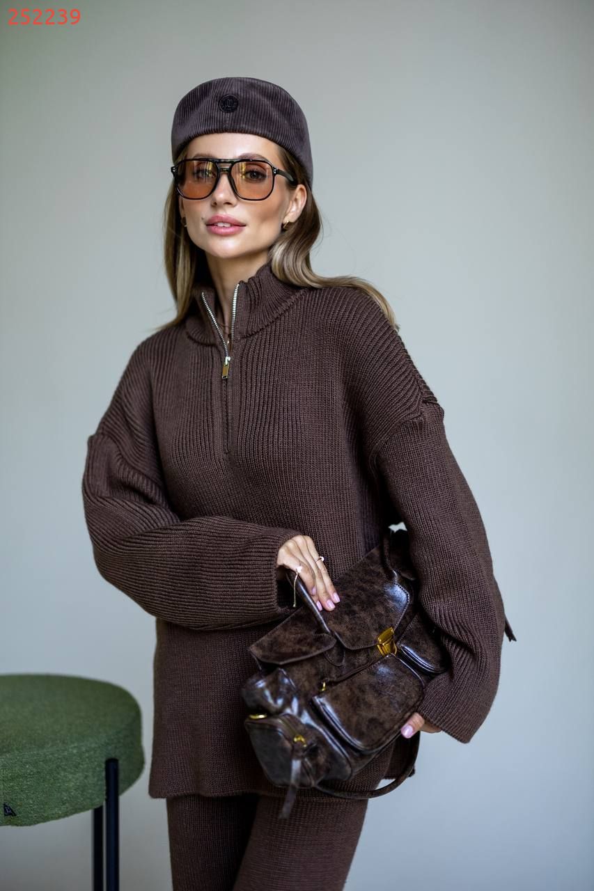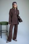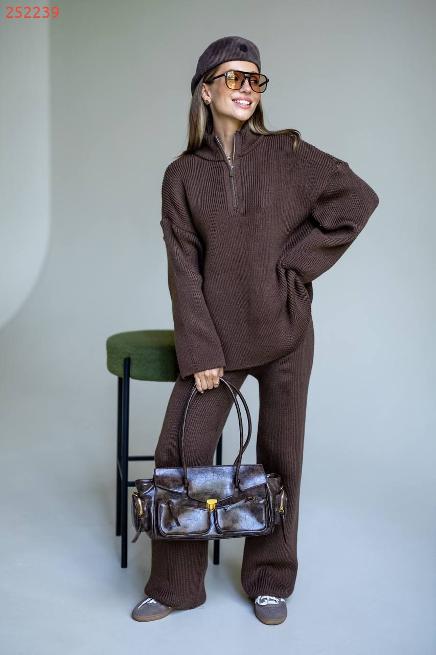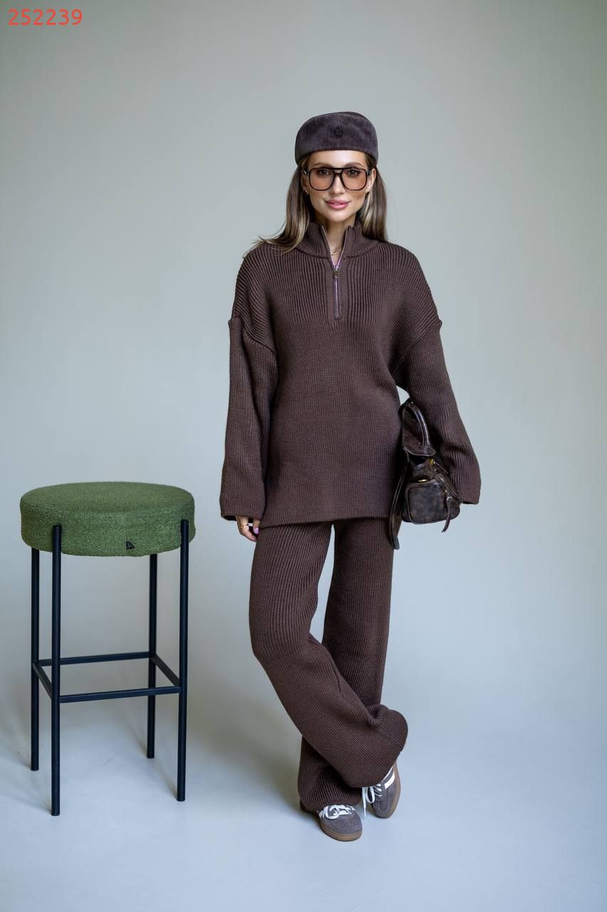 Затишний костюм із м'якої щільної пряжі з ідеальною посадкою. Вільний светр на блискавці та прямі штани створюють стильний та розслаблений силует. Підходить для міста, подорожей та відпочинку.