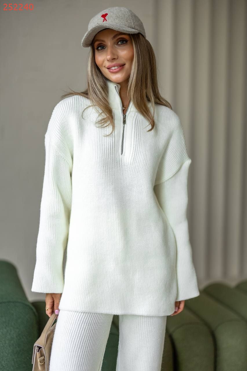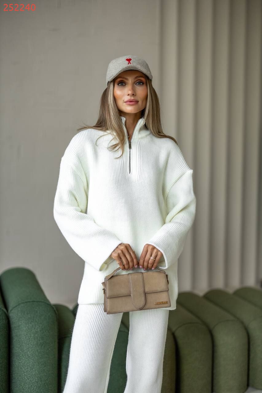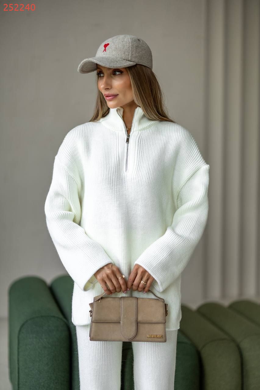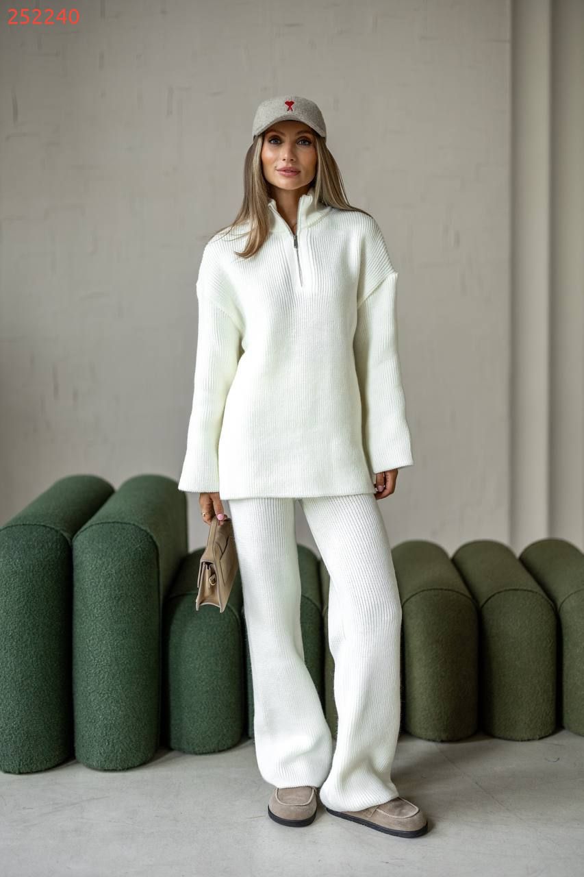 Затишний костюм із м'якої щільної пряжі з ідеальною посадкою. Вільний светр на блискавці та прямі штани створюють стильний та розслаблений силует. Підходить для міста, подорожей та відпочинку.