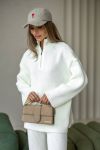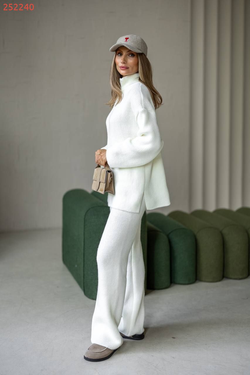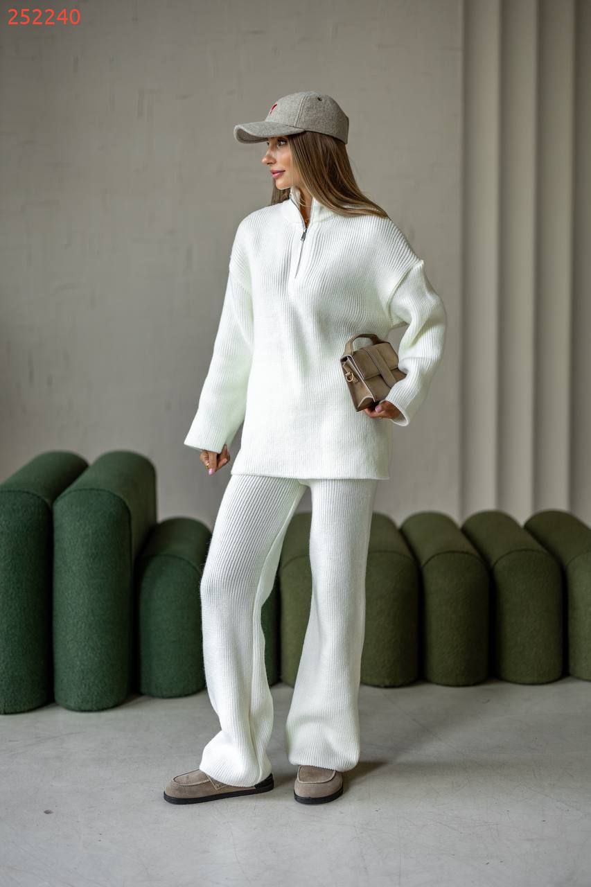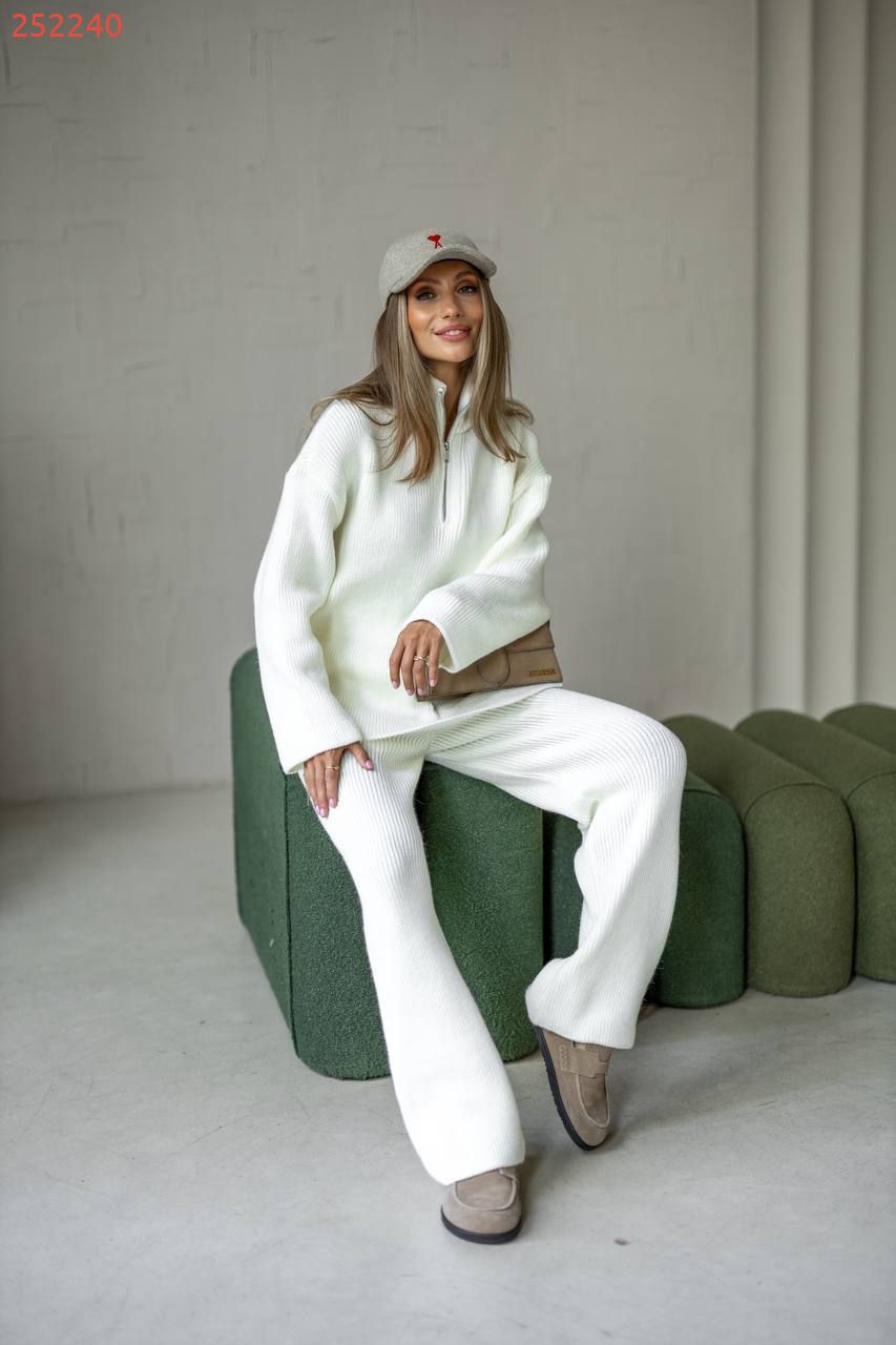 Затишний костюм із м'якої щільної пряжі з ідеальною посадкою. Вільний светр на блискавці та прямі штани створюють стильний та розслаблений силует. Підходить для міста, подорожей та відпочинку.