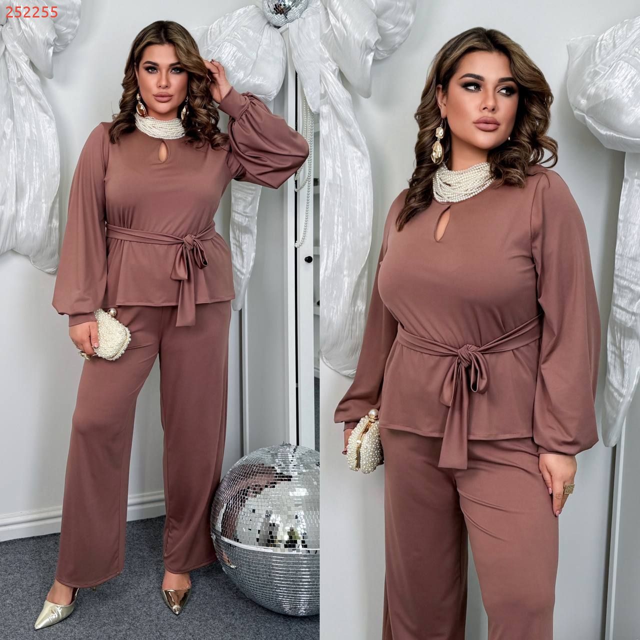 Довжина штанів : 110 см. Святковий костюм двійка . Штани з високою посадкою , пояс на гумці . Кофта прямого покрою з поясом , рукав широкий на манжеті .