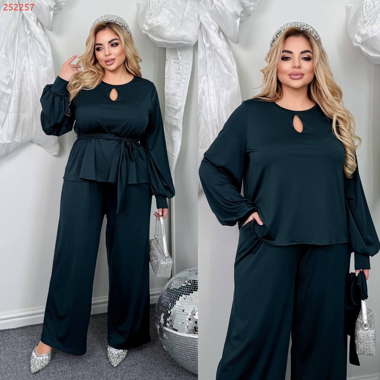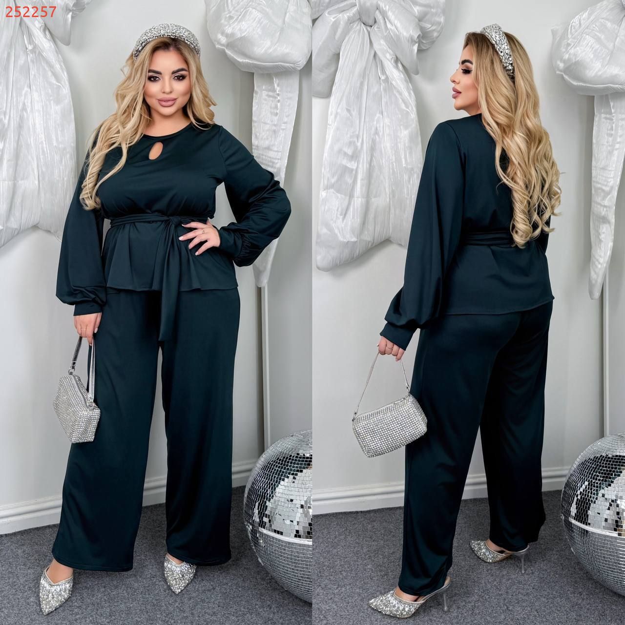 Довжина штанів : 110 см. Святковий костюм двійка . Штани з високою посадкою , пояс на гумці . Кофта прямого покрою з поясом , рукав широкий на манжеті .