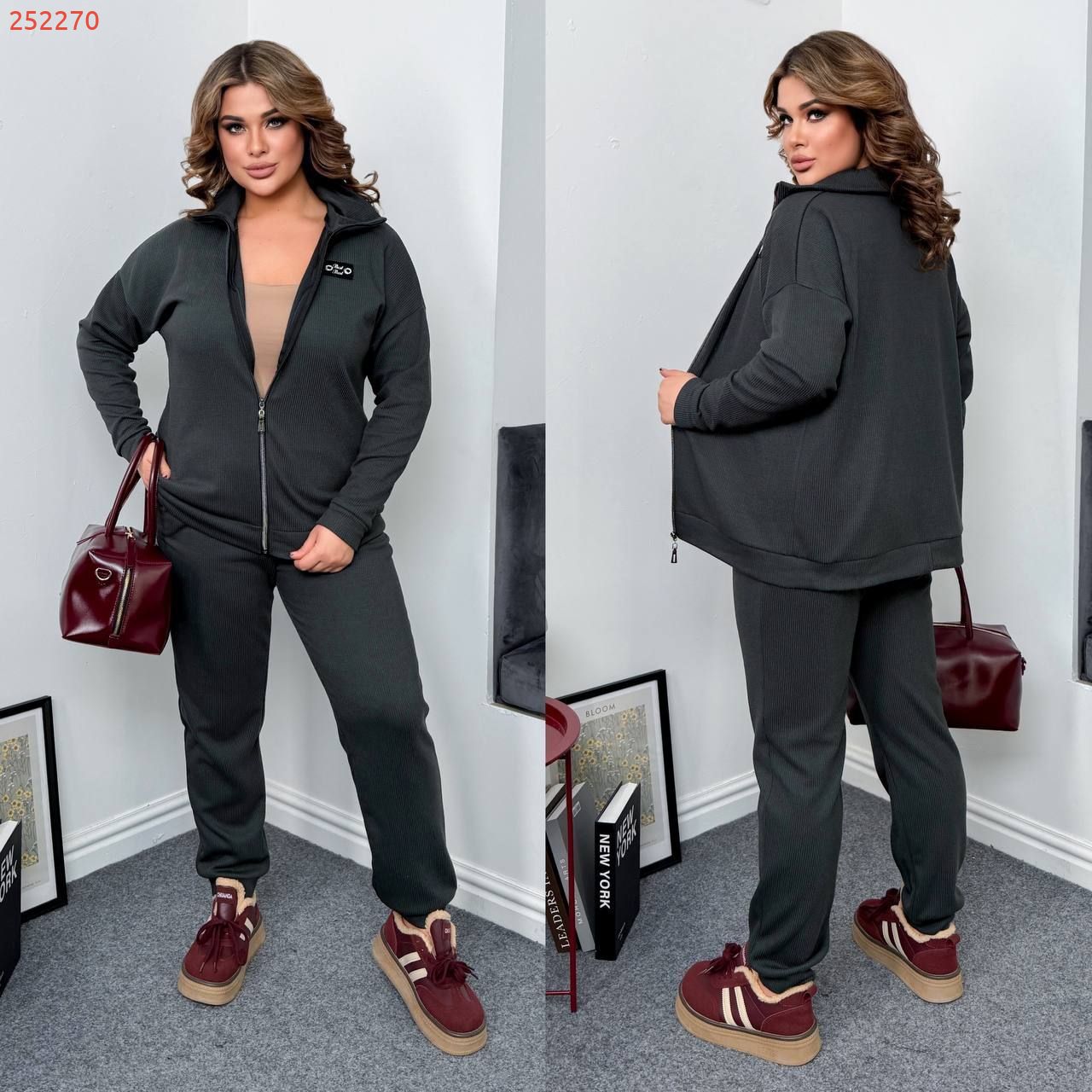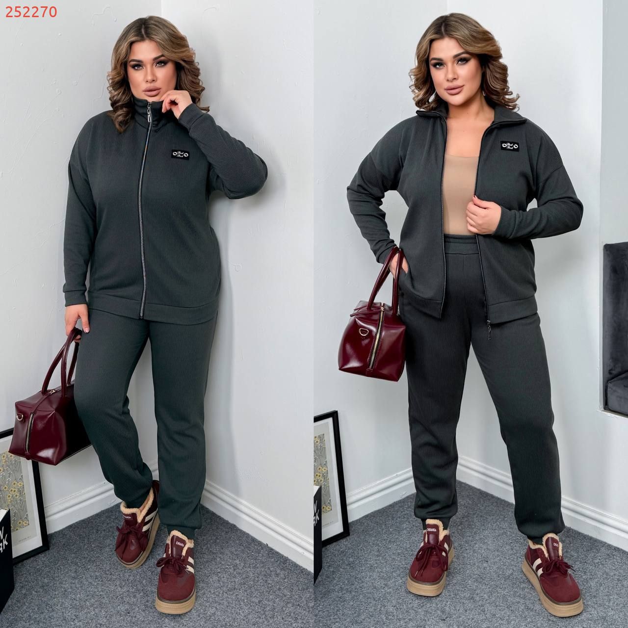 Довжина штанів : 106 см. Теплий костюм на холодну пору . Штани з високою посадкою , пояс на гумці , низ на манжеті . Кофта прямого покрою , з стійкою , на блискавці .