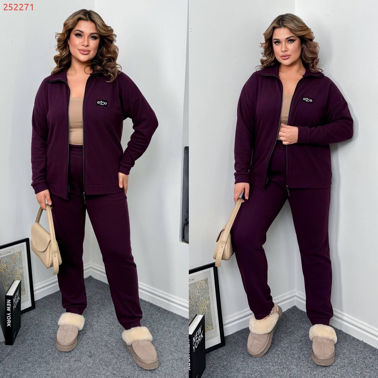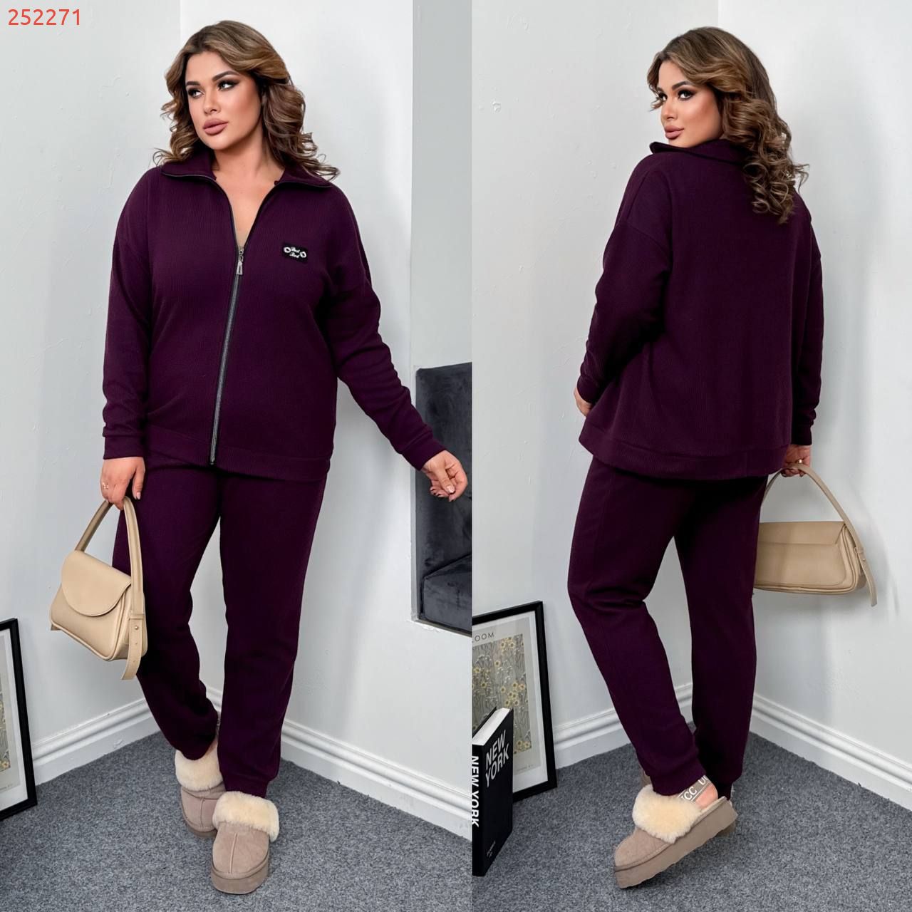 Довжина штанів : 106 см. Теплий костюм на холодну пору . Штани з високою посадкою , пояс на гумці , низ на манжеті . Кофта прямого покрою , з стійкою , на блискавці .