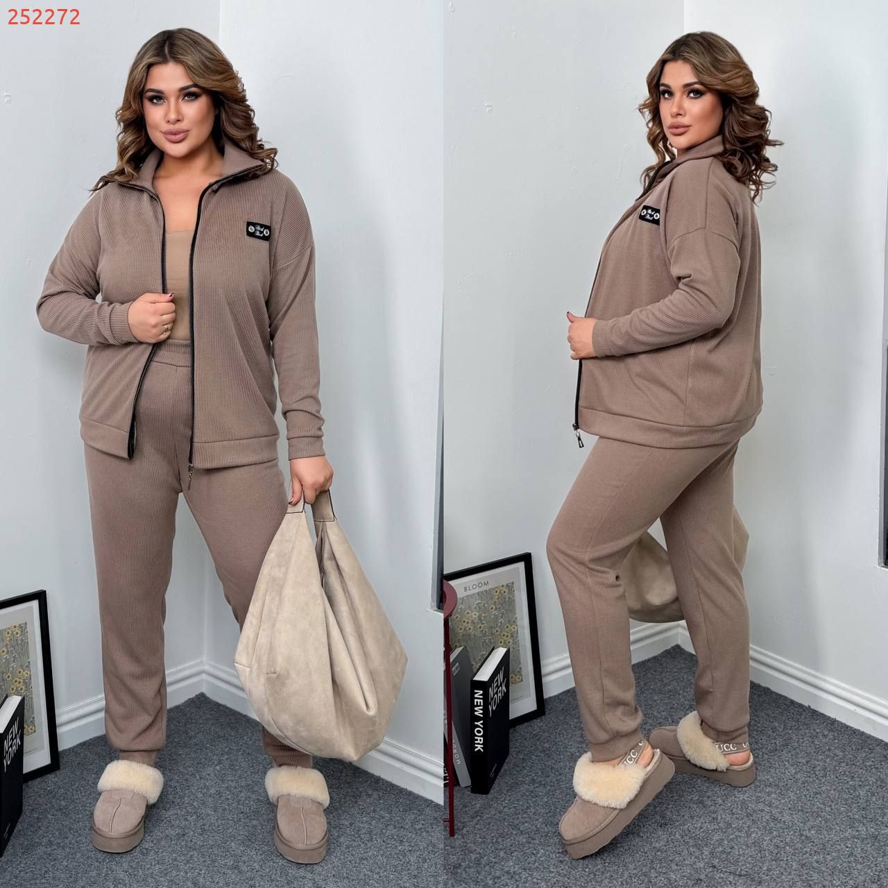 Довжина штанів : 106 см. Теплий костюм на холодну пору . Штани з високою посадкою , пояс на гумці , низ на манжеті . Кофта прямого покрою , з стійкою , на блискавці .