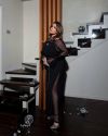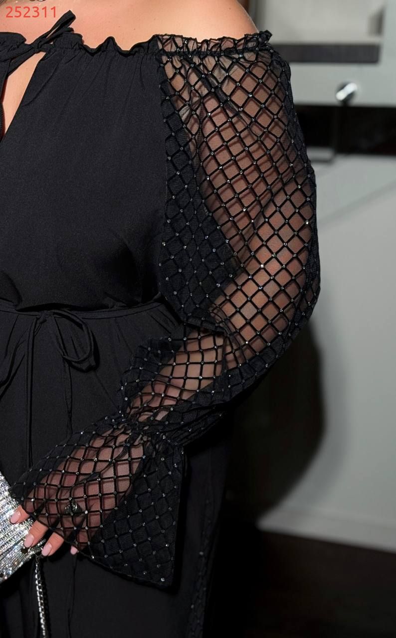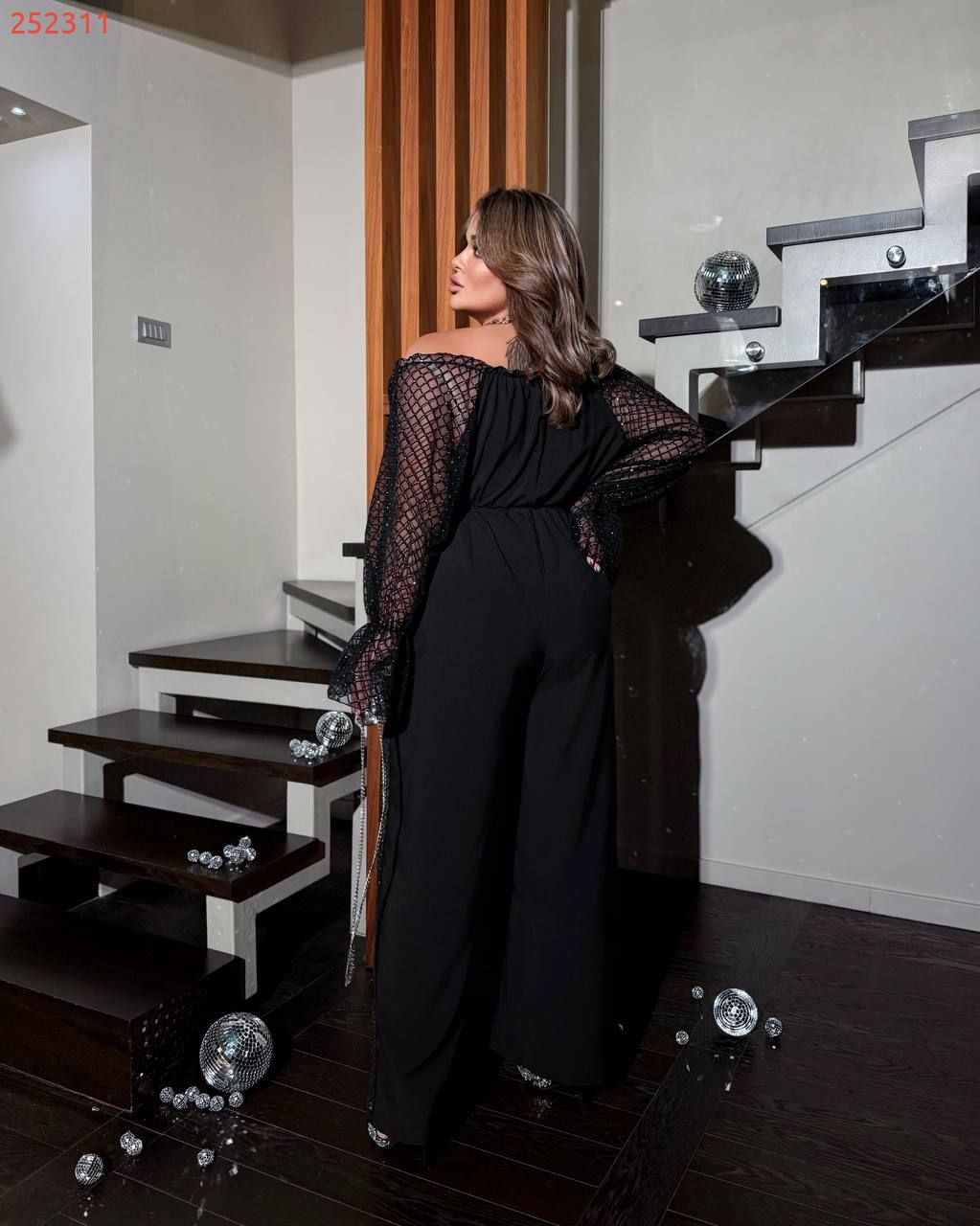 Тканина: нестрейчева, легка тканина гарної якості . Рукава- сітка з візерунком із флоку та блиском. По горловині гумка , можна закривати плечі або обнажити область декольте. Можна носити в вільному стилі. Або приталювати пояском. На одній нозі- кокетлива полу прозора вставка . Довжина комбінезону по шаговому шву (по внутреннему шву брбк) - 78 см. По плечам гумка - тому сідає гарно(тягнеться) на на будь-який зріст