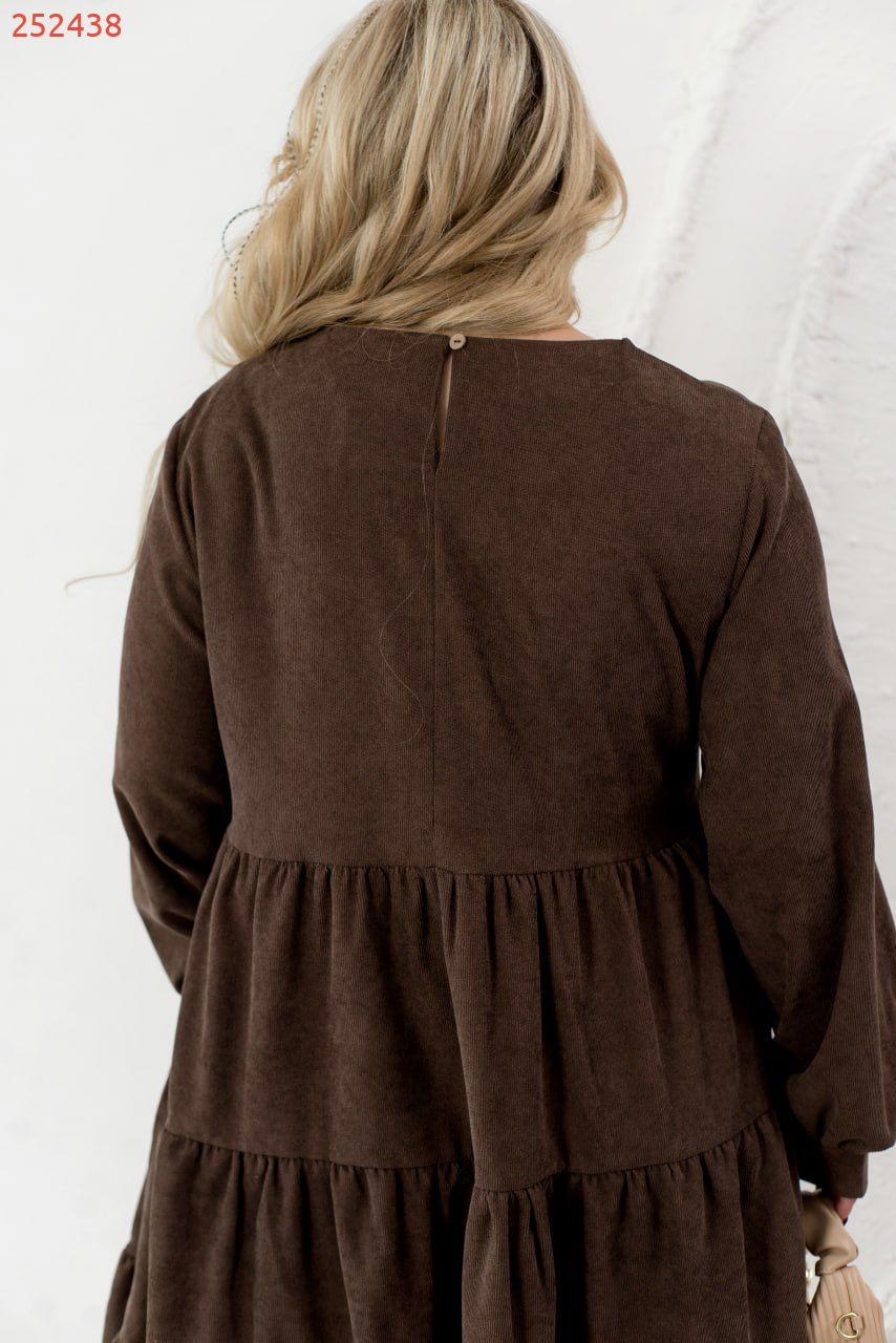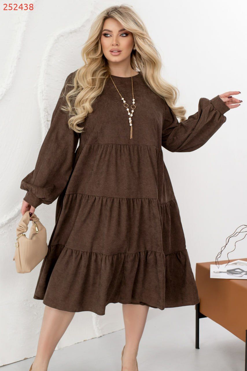 Повітряна сукня А-силуету, виконана з м'якого вельвету, дозволить вам навіть в прохолодну погоду і пору року виглядати жіночно і привабливо. Модель доповнена довгими рукавами з манжетами і застібкою на маленький гудзик під шиєю. Легкий подол, що складається з декількох шарів воланів, зробить ваш образ виразним і незабутнім.