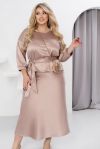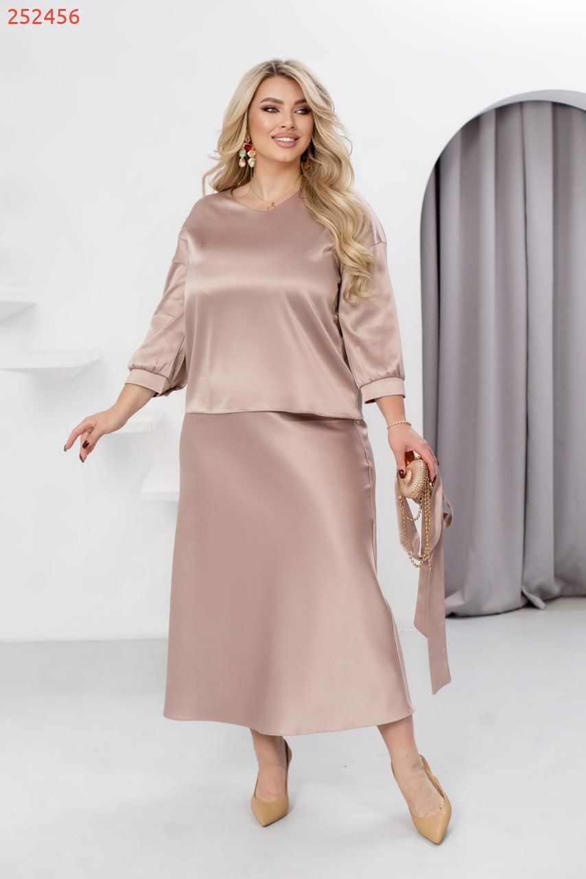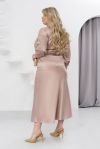 Елегантний святковий костюм зі спідницею, створений із розкішного костюмного шовку, стане вашим ідеальним образом для новорічних свят. Він поєднує витонченість і комфорт, роблячи вас зіркою будь-якої святкової події. Блуза з V-подібним вирізом створює акцент на зоні декольте, додаючи образу жіночності. Спущена лінія плечей та рукави довжиною 3/4 з манжетами на ґудзиках забезпечують стильний вигляд і зручність. Довга спідниця на резинці комфортно сідає по фігурі, а текстильний пояс, що входить до комплекту, дозволяє підкреслити талію та додає завершеності образу. Цей костюм створений, щоб ви відчували себе впевнено й виглядали розкішно під час зустрічі Нового року чи будь-якого іншого особливого заходу.