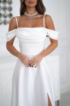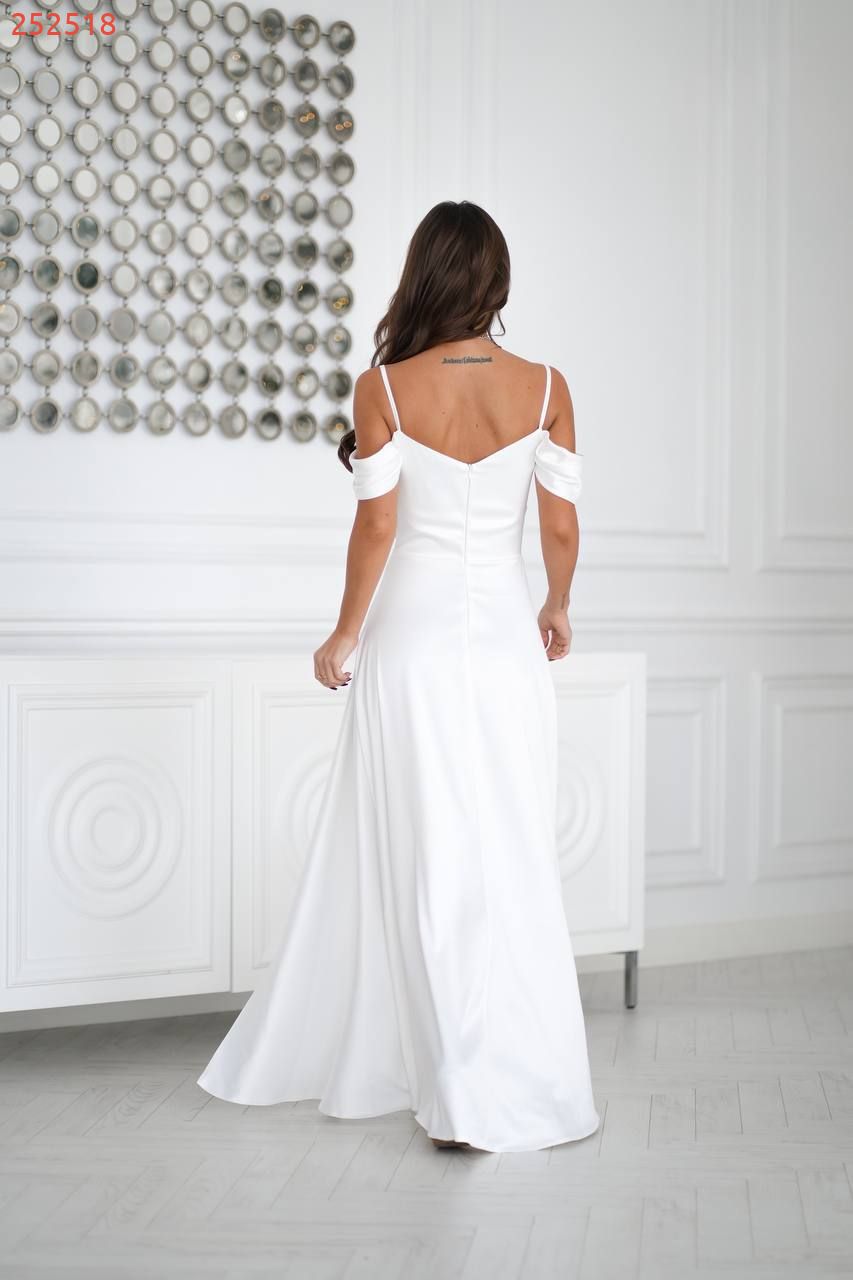 Атласна сукня зі спущеними рукавамина брителях, озлобленна драпіруванням у зоні декольте, що надає образу витонченості та жіночності. Сукня ідеально підходить для особливих випадків, таких як весілля, вечірки або фотосесії.