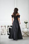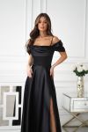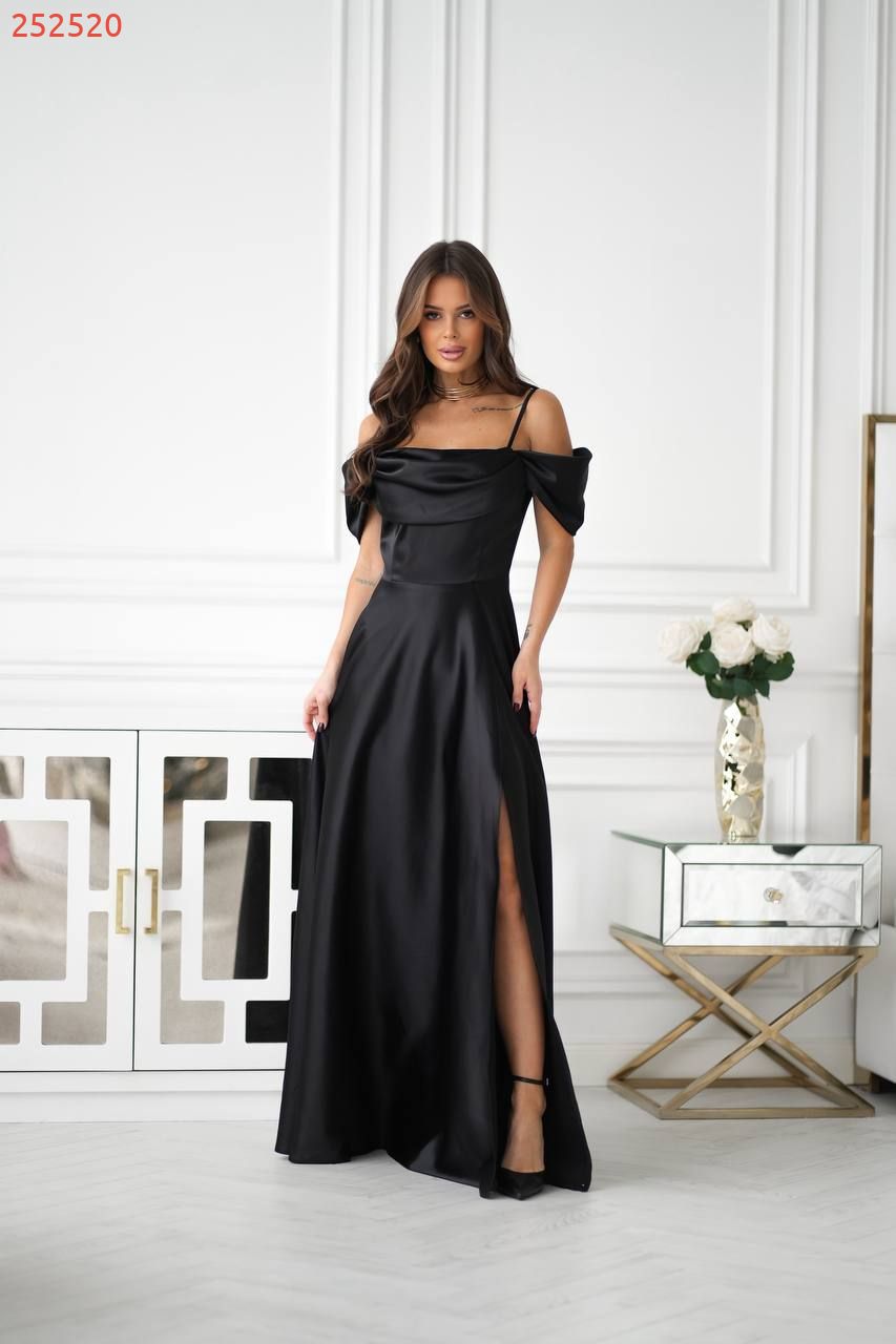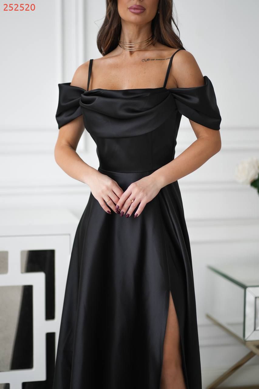 Атласна сукня зі спущеними рукавамина брителях, озлобленна драпіруванням у зоні декольте, що надає образу витонченості та жіночності. Сукня ідеально підходить для особливих випадків, таких як весілля, вечірки або фотосесії.