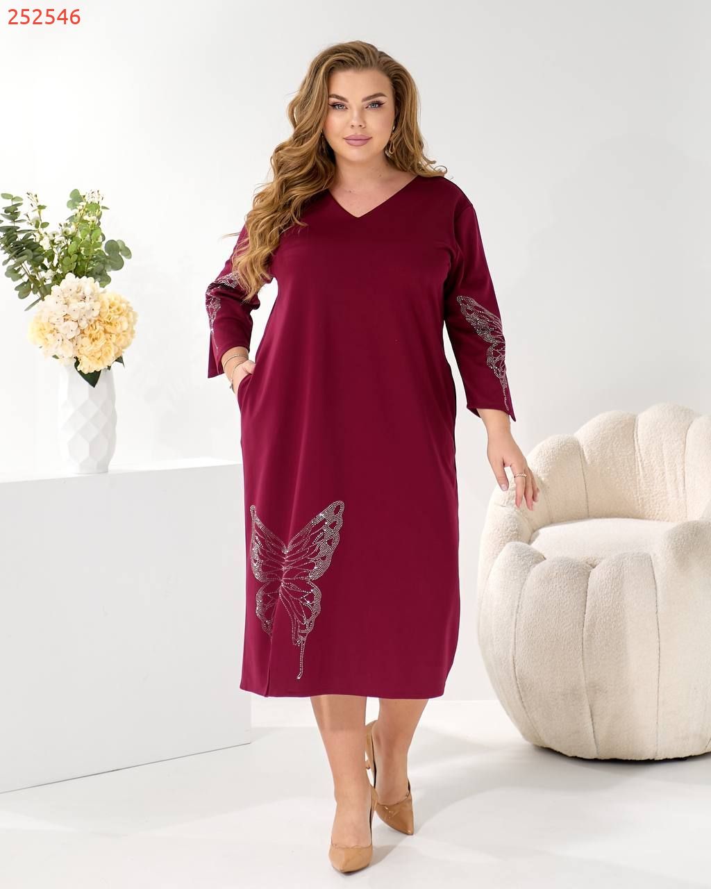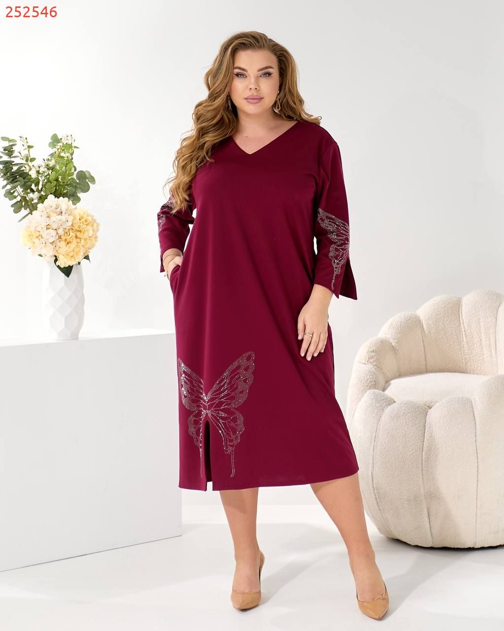 Представляємо елегантну сукню міді, виконану у вільному, прямому крої з V-подібним вирізом, що гарантує ідеальну посадку на будь-яку фігуру.