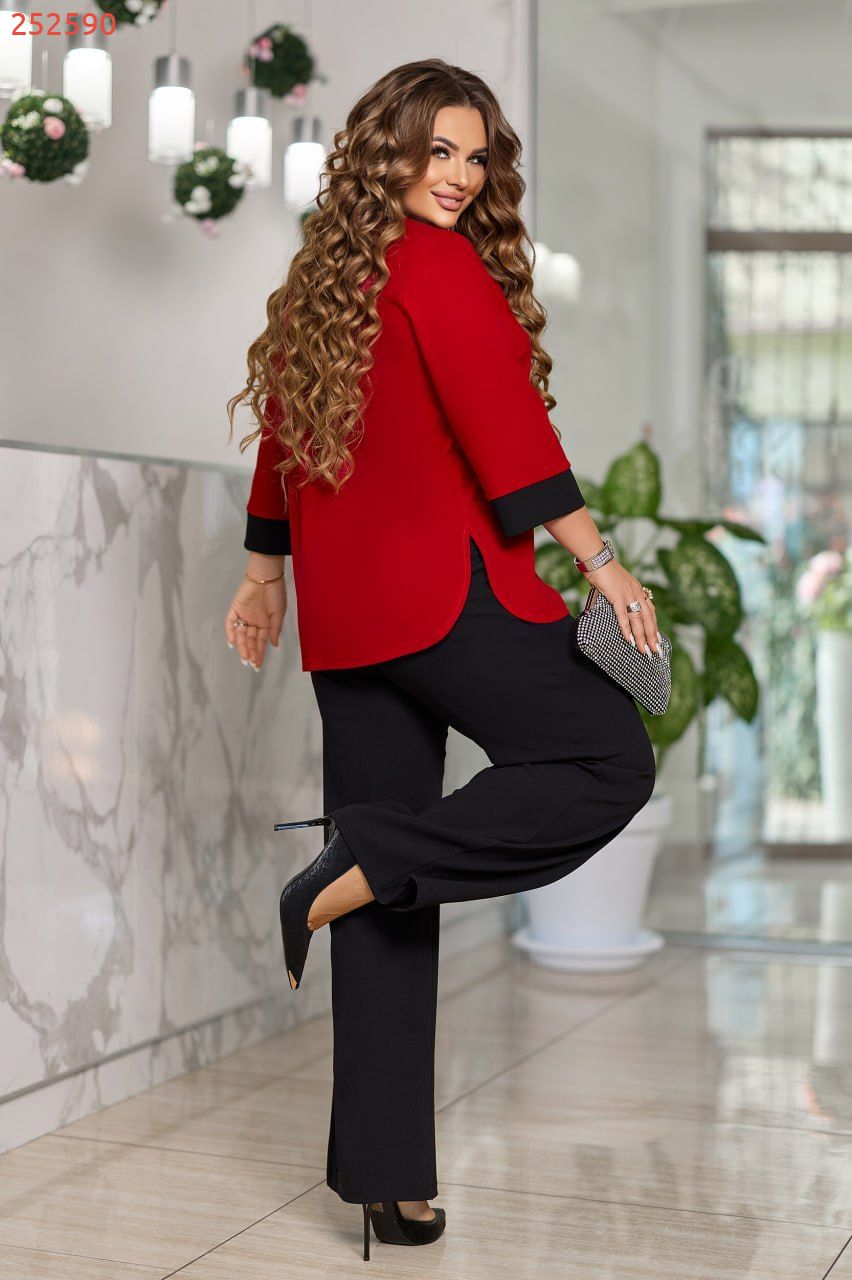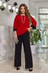 Жіночий трендовий костюм, що складається з блузи та штанів. Блуза вільного силуету, виріз горловини округлий. Штани із завищеною талією, вільної форми, вигідно підкреслюють витонченість ніг та надають fashion нотці образу. Зручна в носінні тканина, гарна посадка по фігурі, універсальність і лаконічність моделі не залишать байдужою жодну жінку.